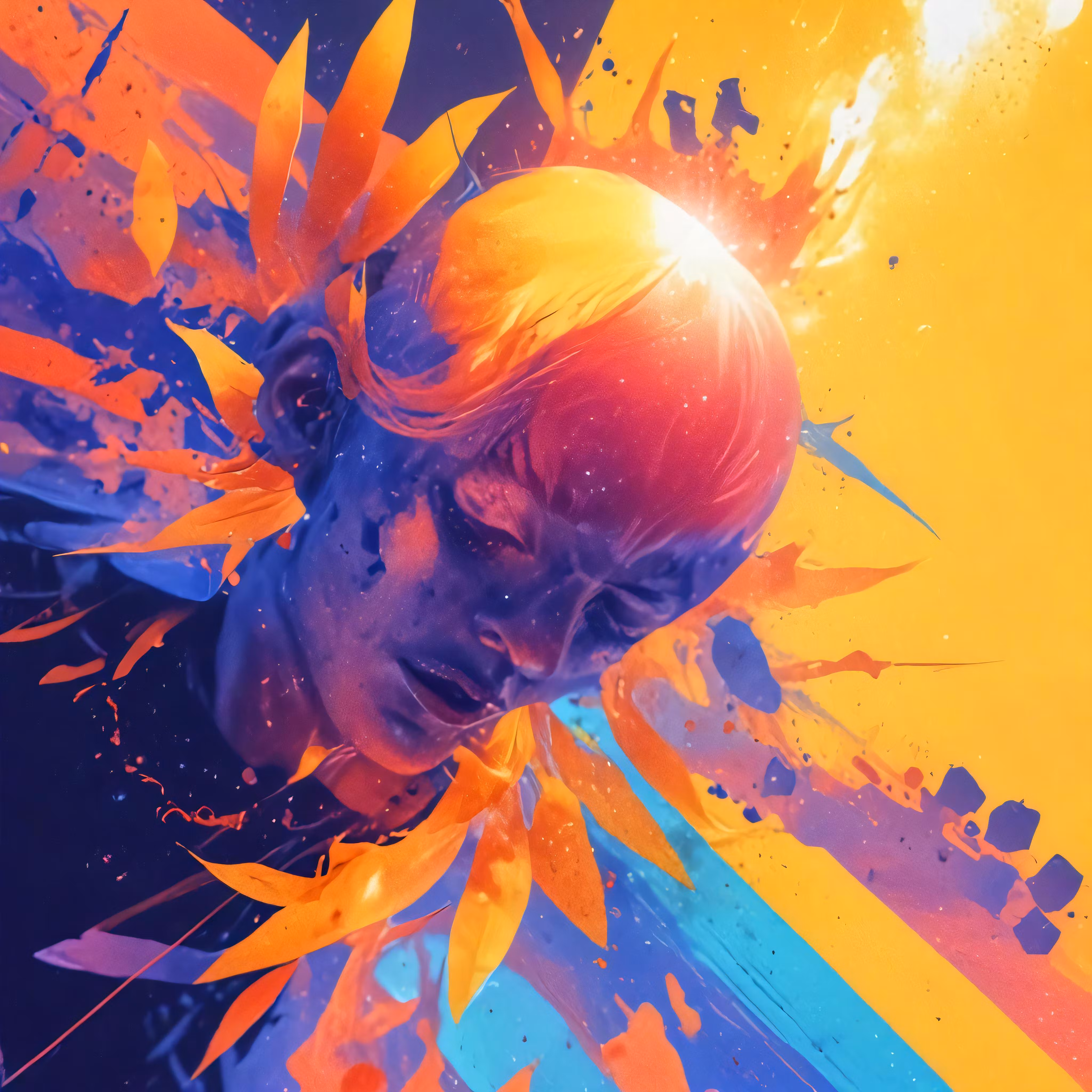High resolution picture, free to use, a person is shown looking up at the sky and surrounded by bright colored paint splats