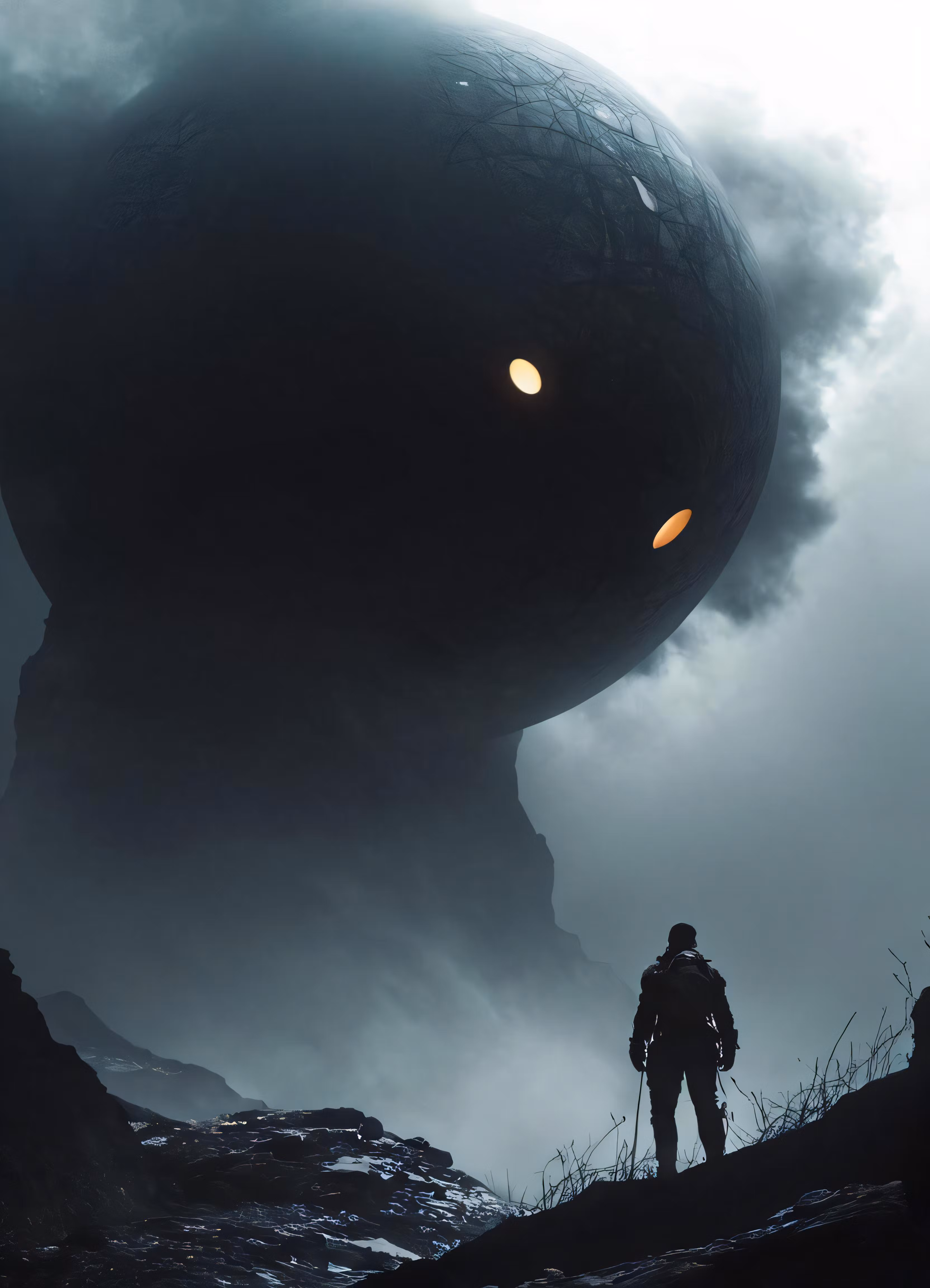 High resolution picture, free to use, a person is standing on a hill in front of a giant alien creature