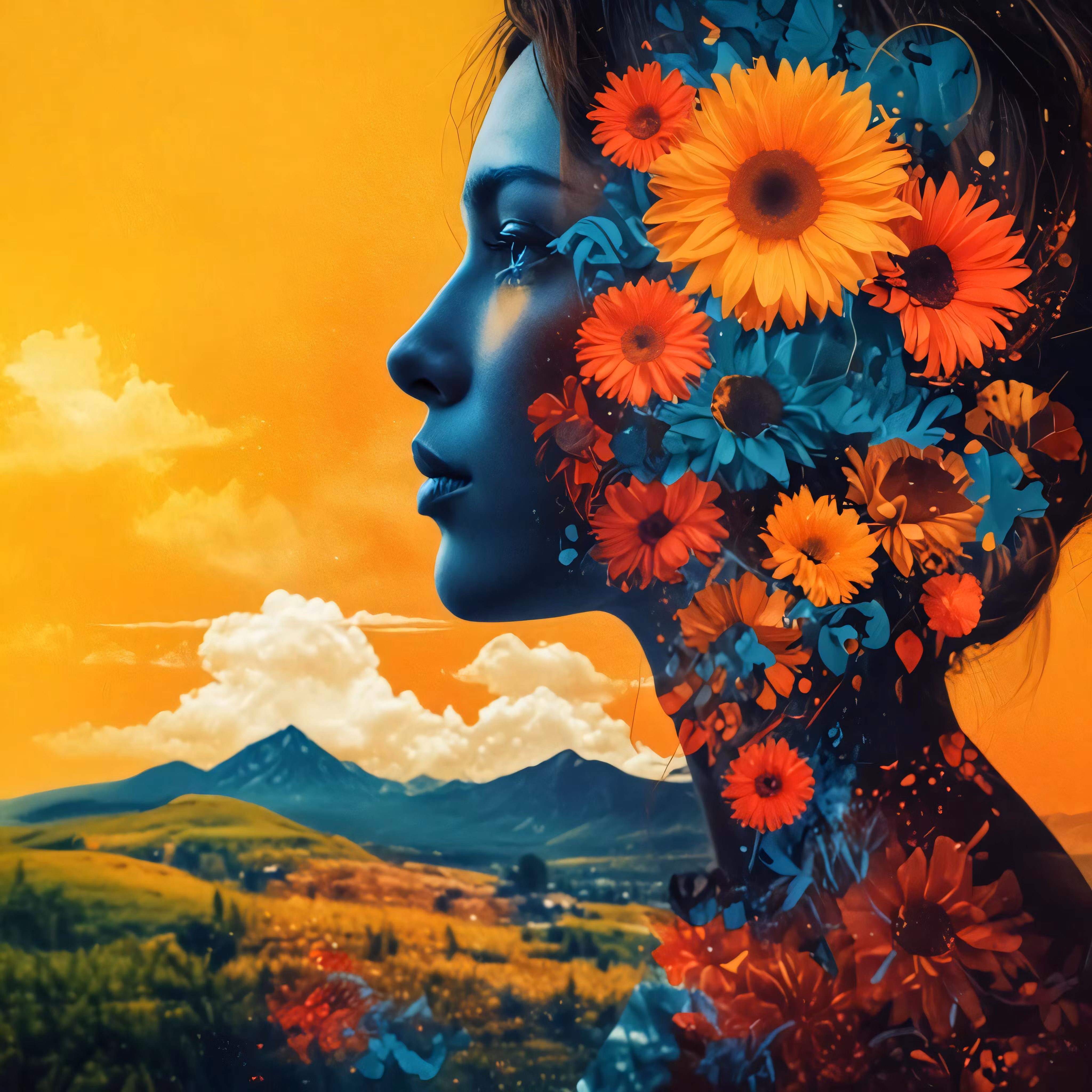 High resolution picture, free to use, a person is surrounded by flowers in a yellow and orange background