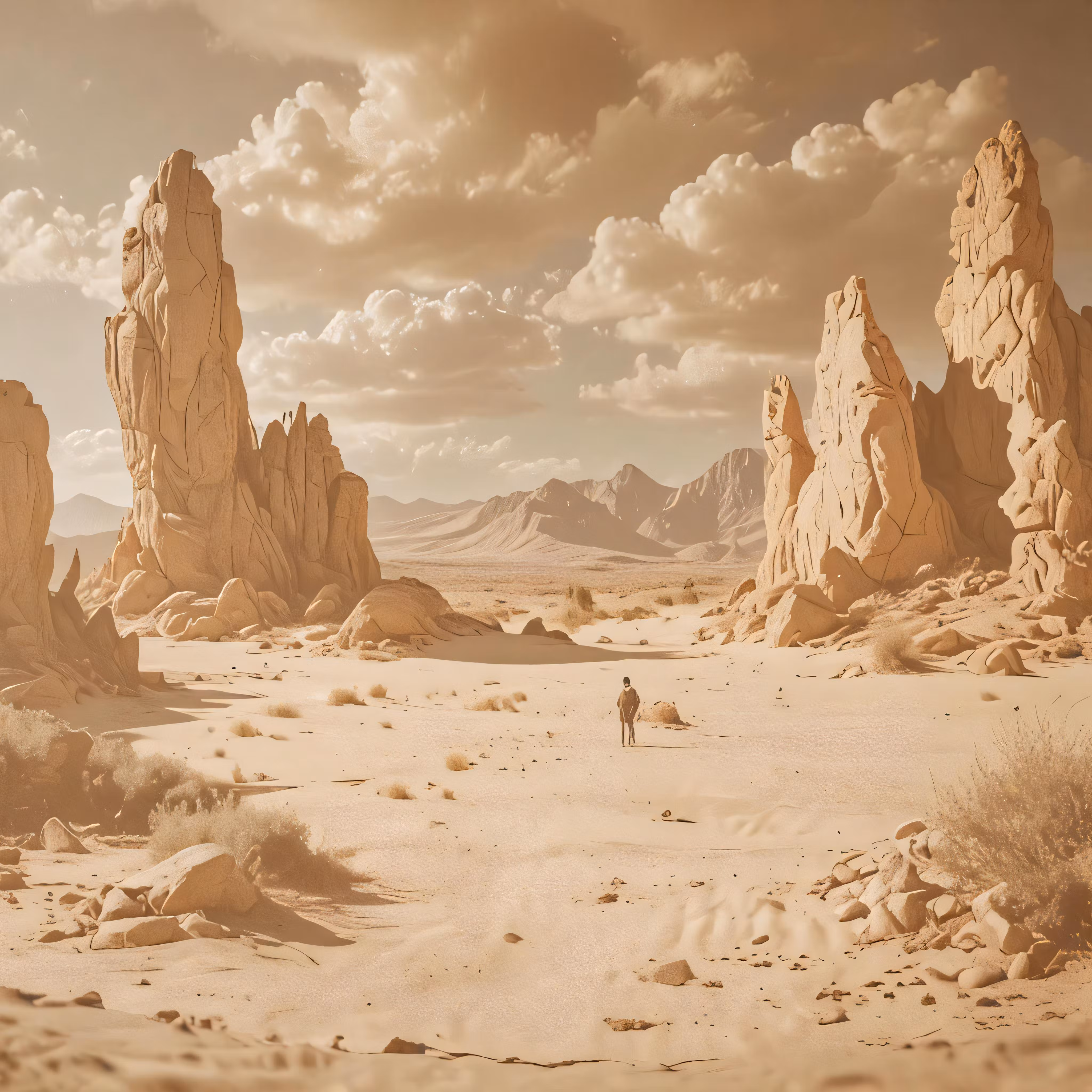 High resolution picture, free to use, a person is walking in the desert near some rocks