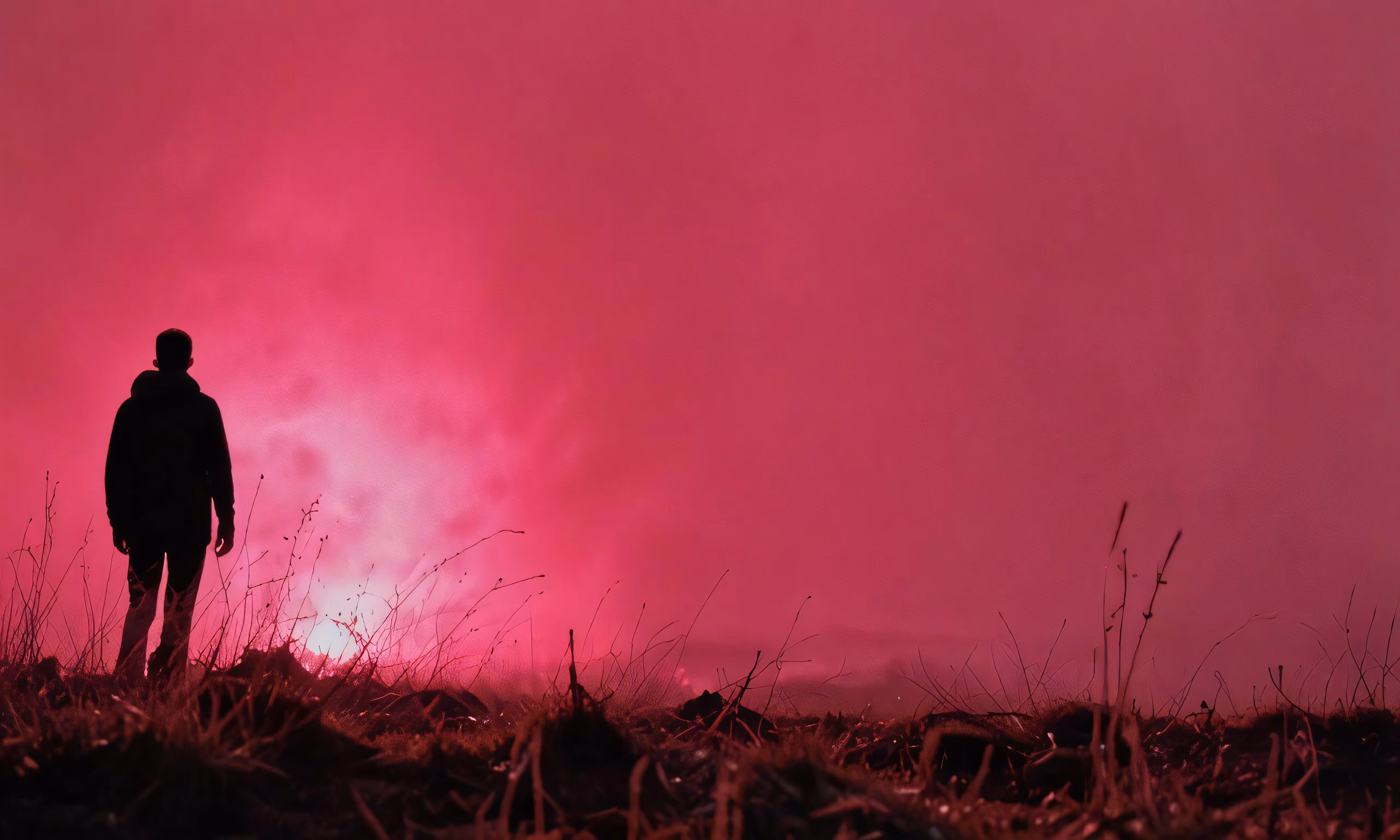 High resolution picture, free to use, a person looks out over the water at a purple sky