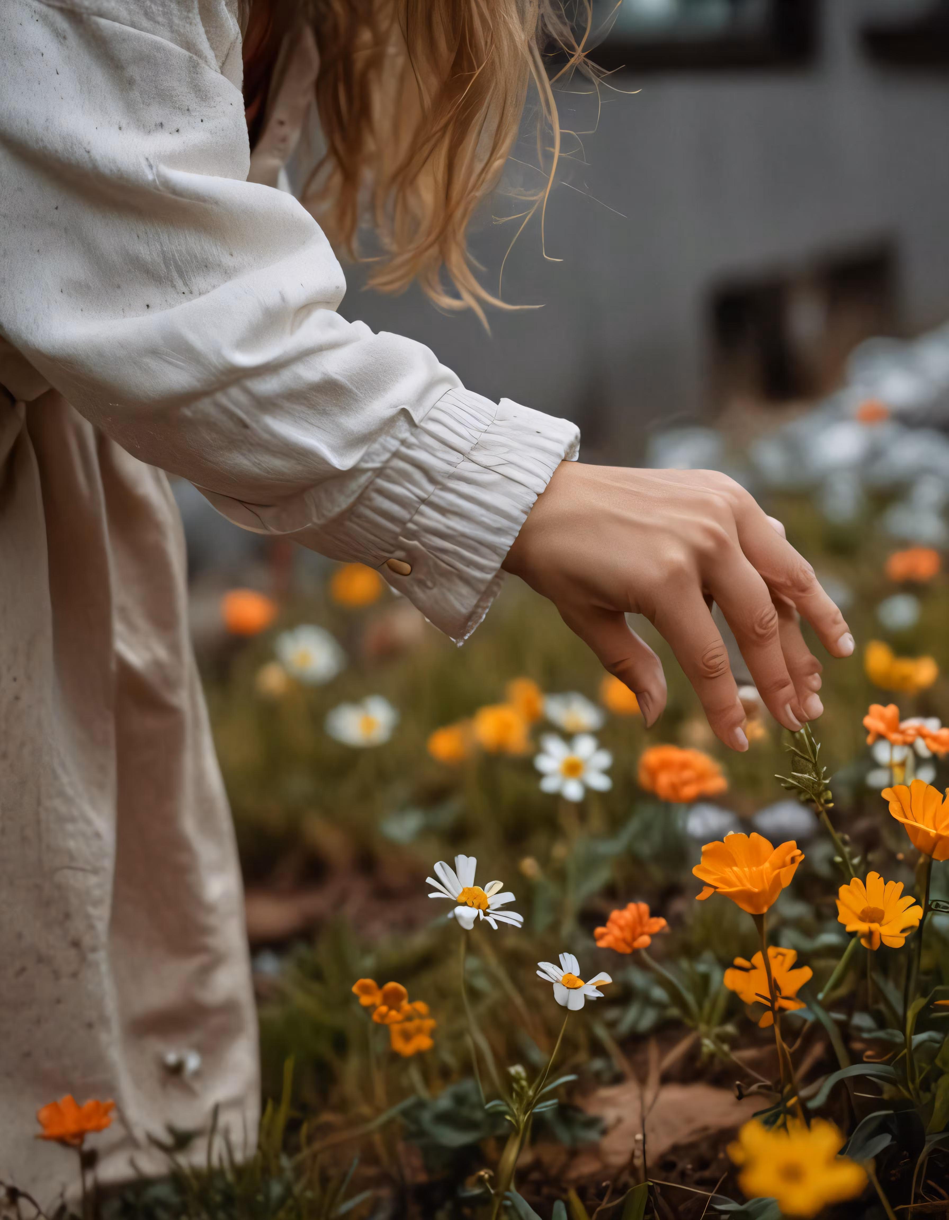 High resolution picture, free to use, a person reaches for some wildflowers in the grass