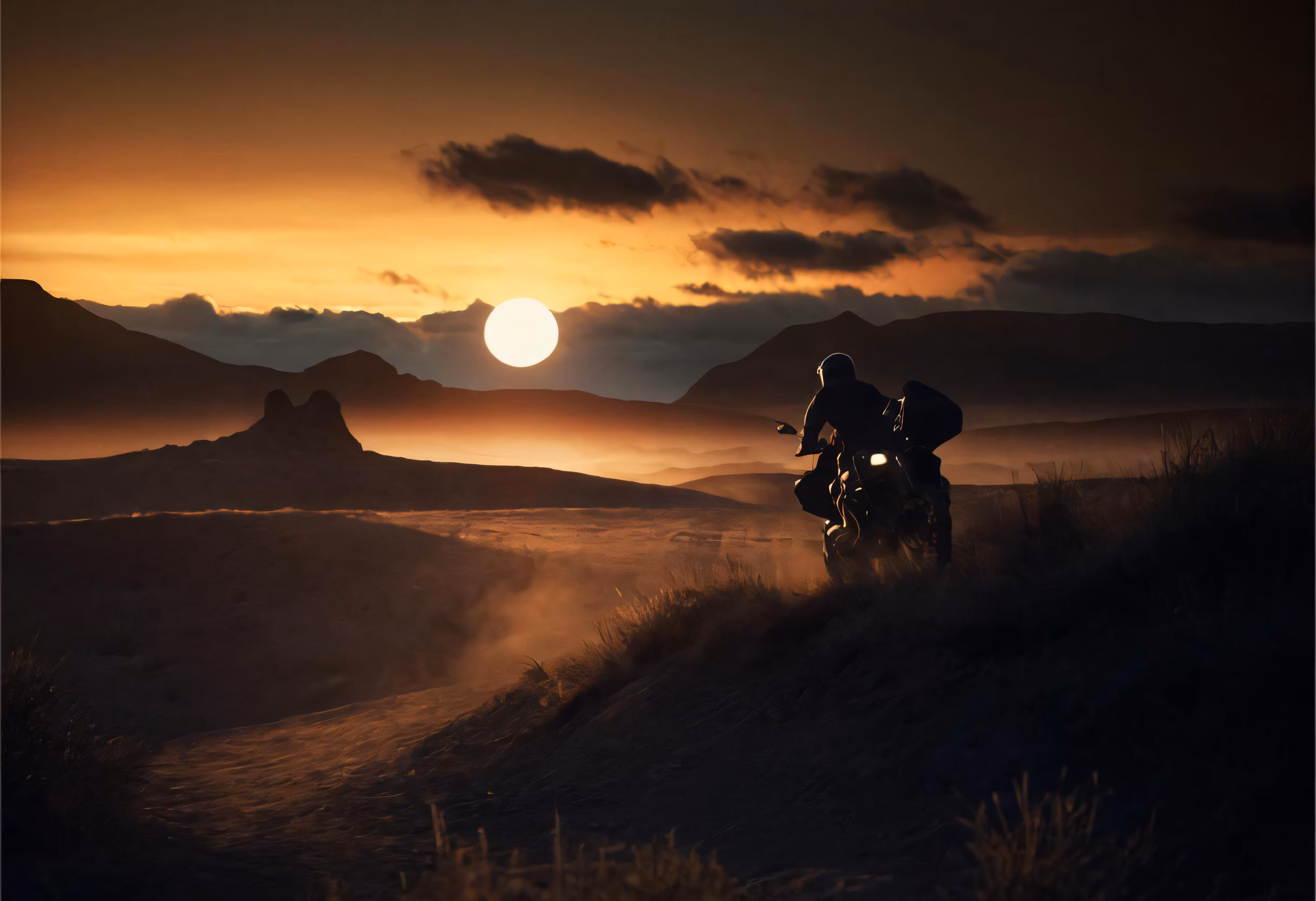 High resolution picture, free to use, a person riding a motorcycle across a dirt field