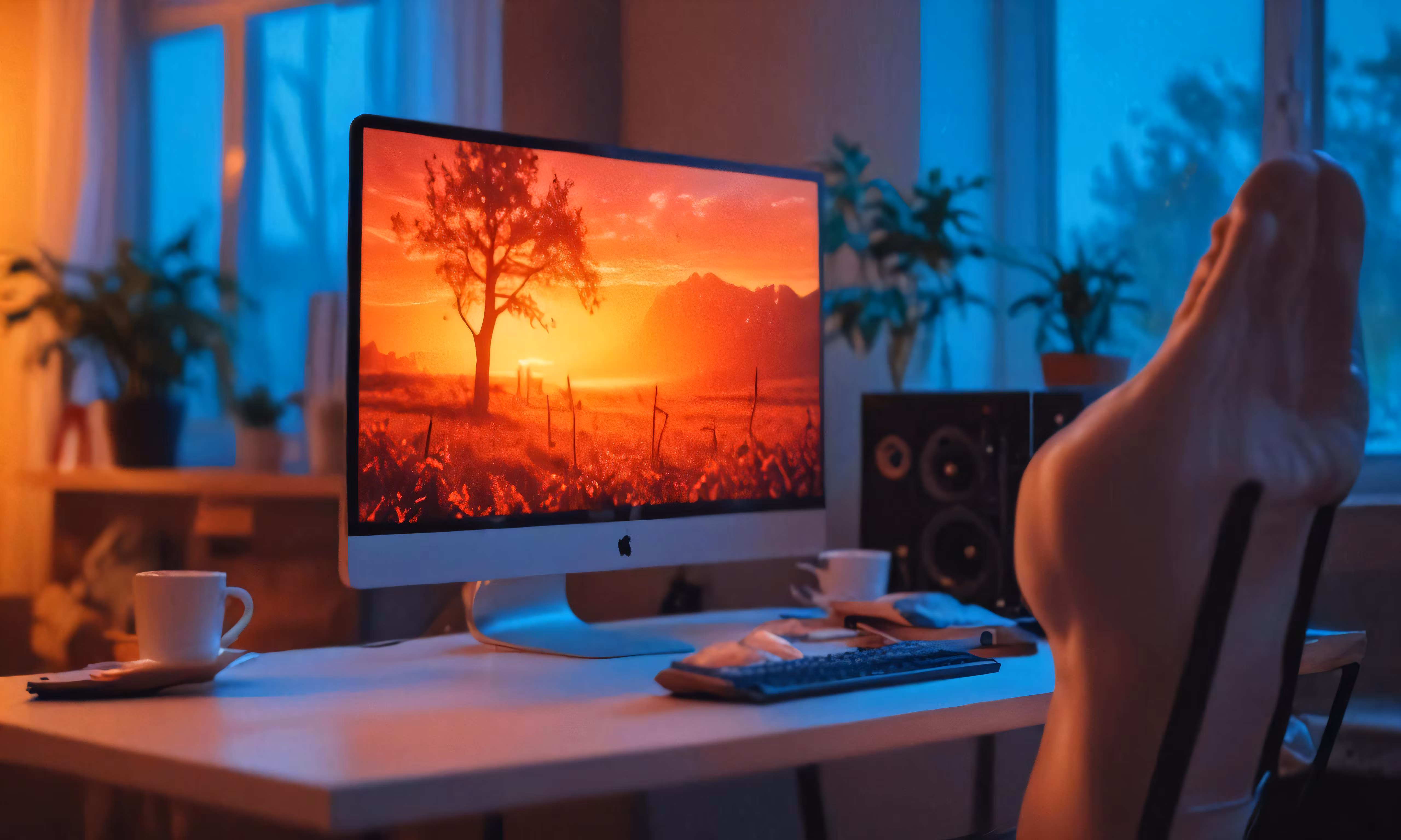 High resolution picture, free to use, a person sits in front of a computer monitor as the sun sets