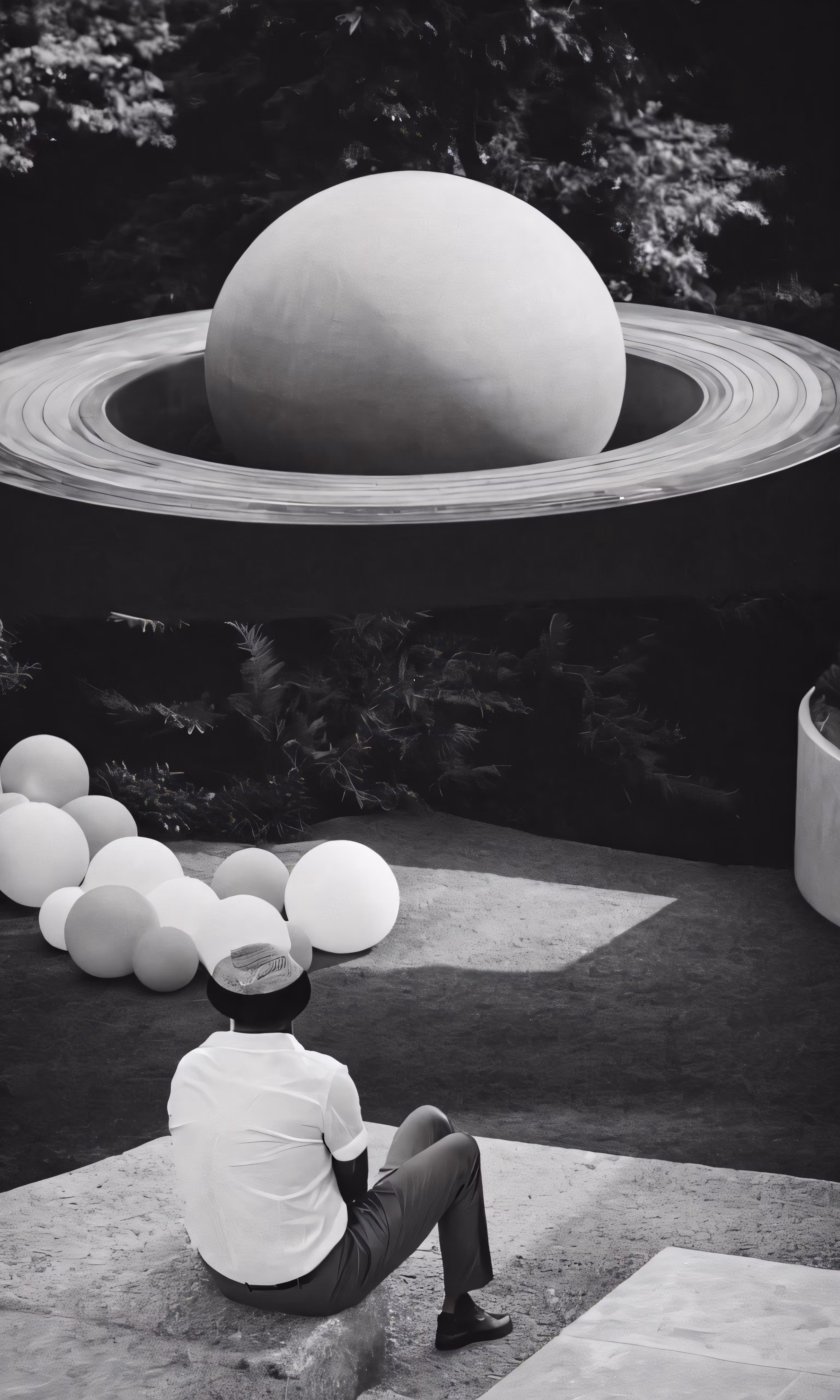 High resolution picture, free to use, a person sits on a cement slab next to some balls