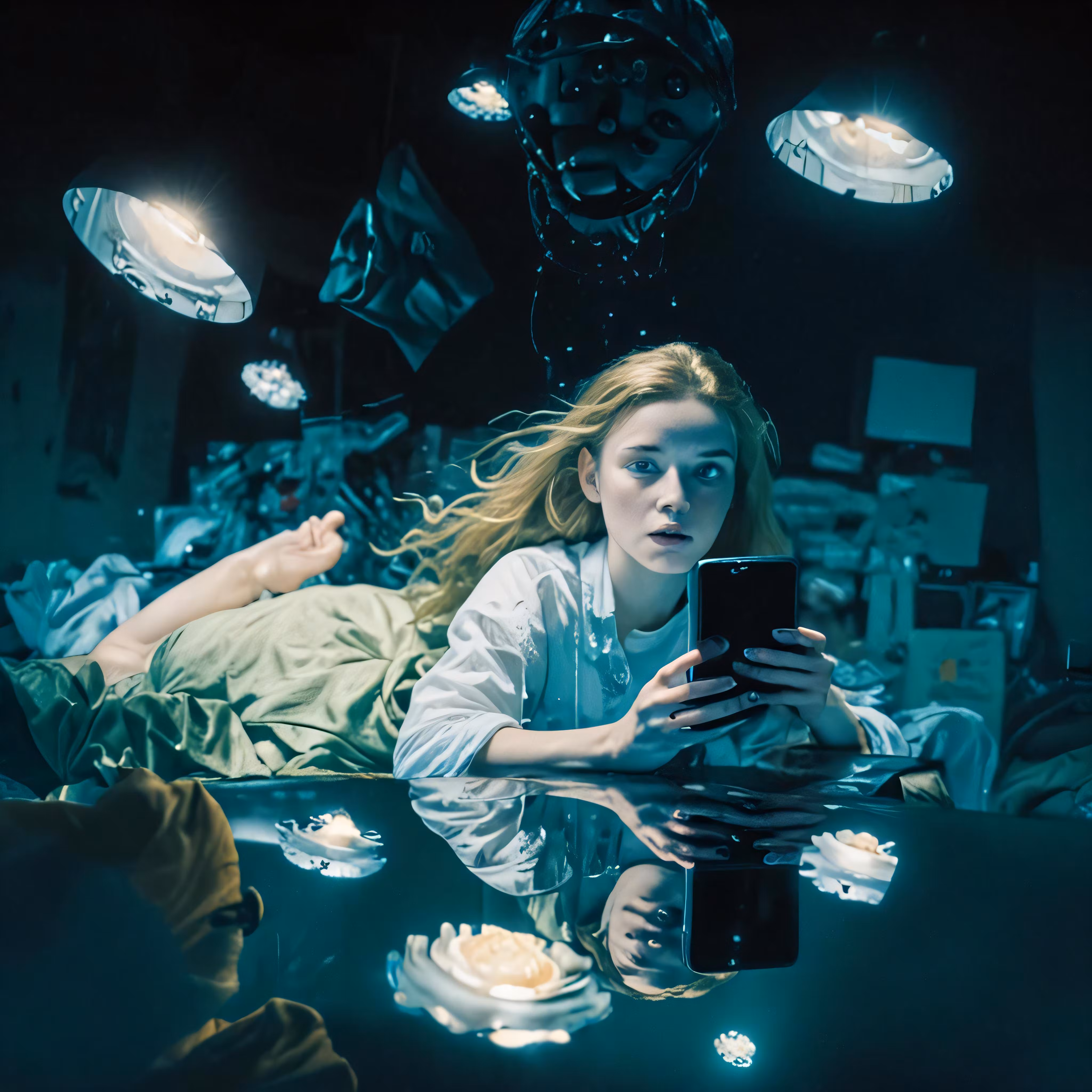 High resolution picture, free to use, a person sitting in a dark room holding a cell phone