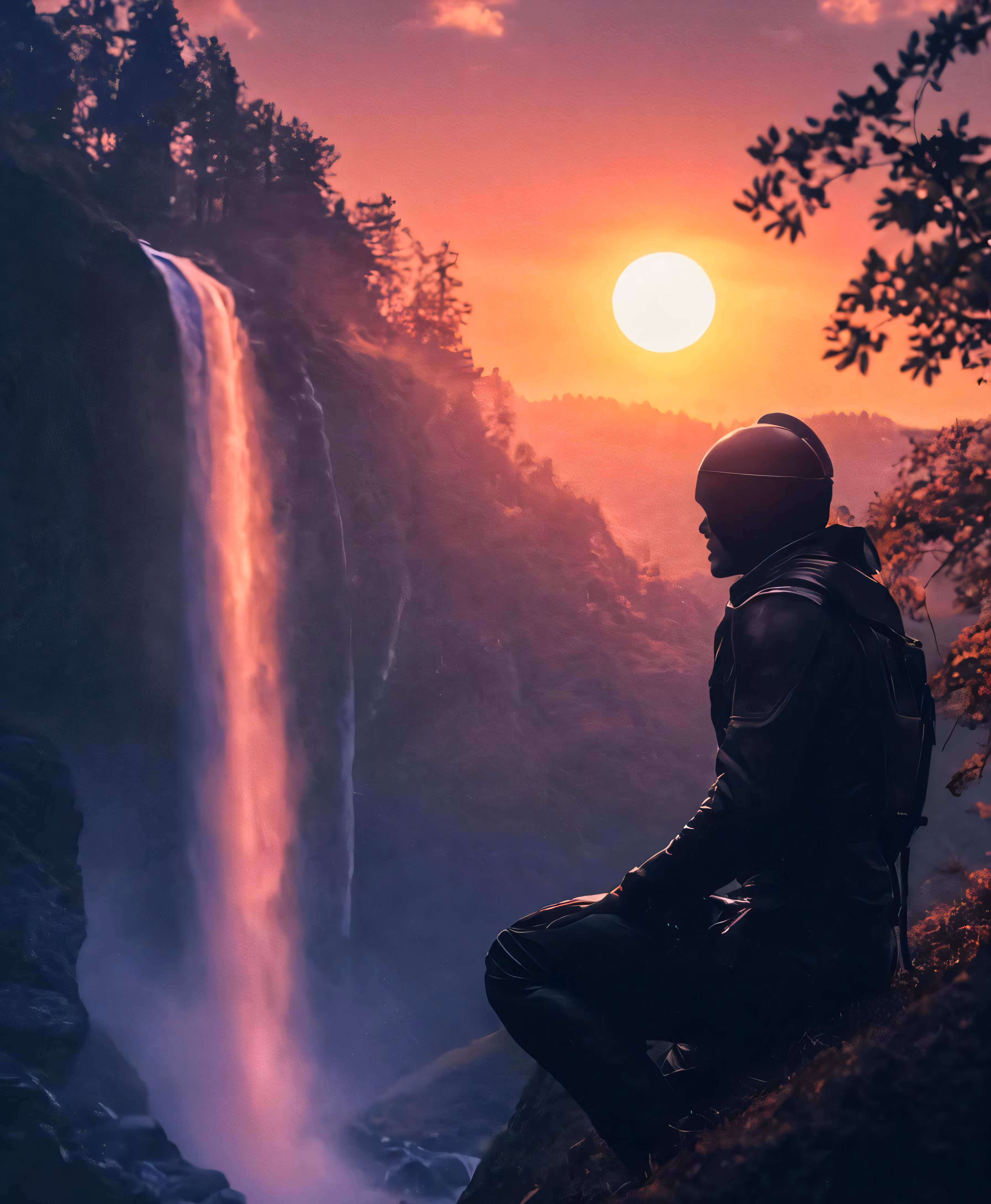 High resolution picture, free to use, a person sitting in front of a large waterfall