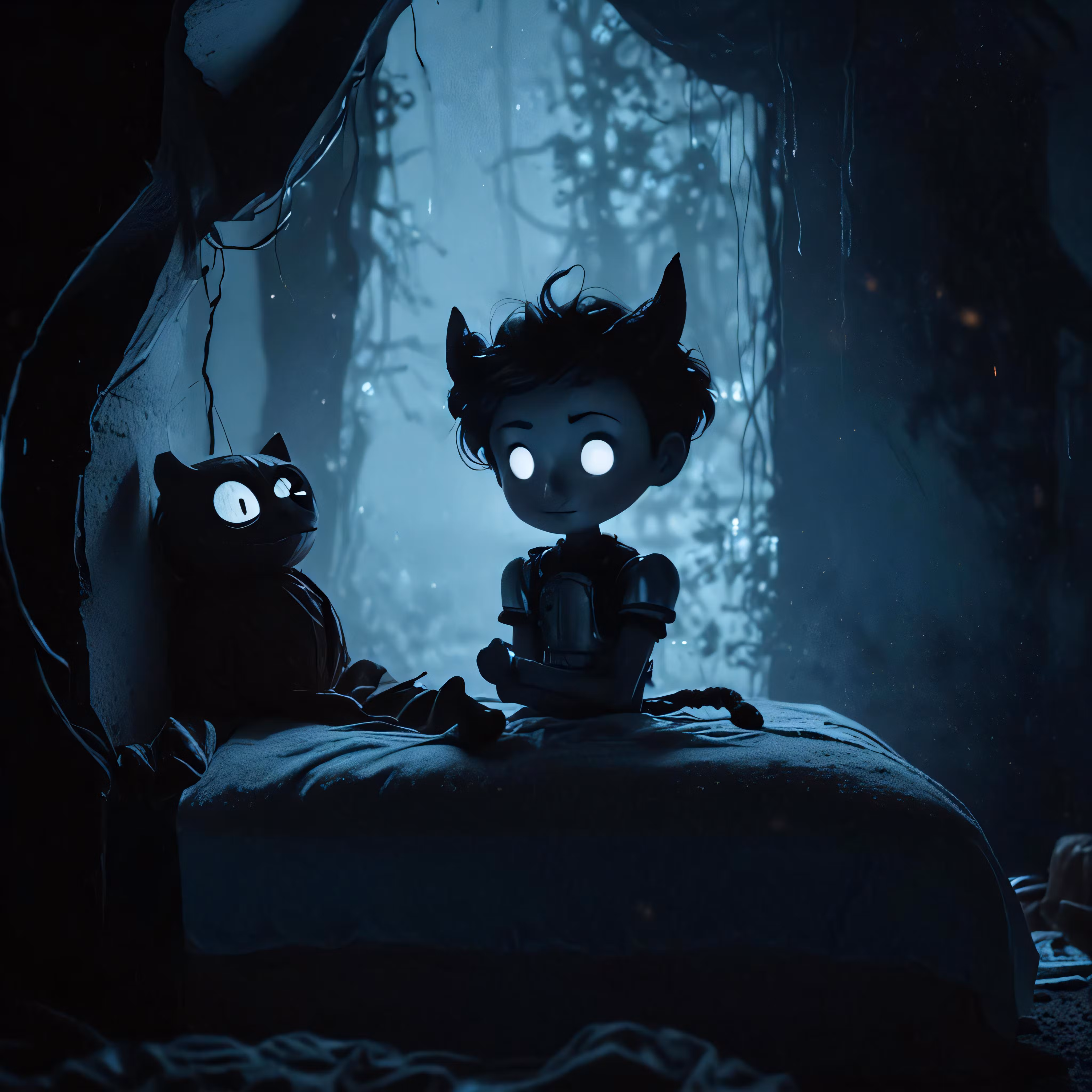 High resolution picture, free to use, a person sitting on a bed with glowing eyes