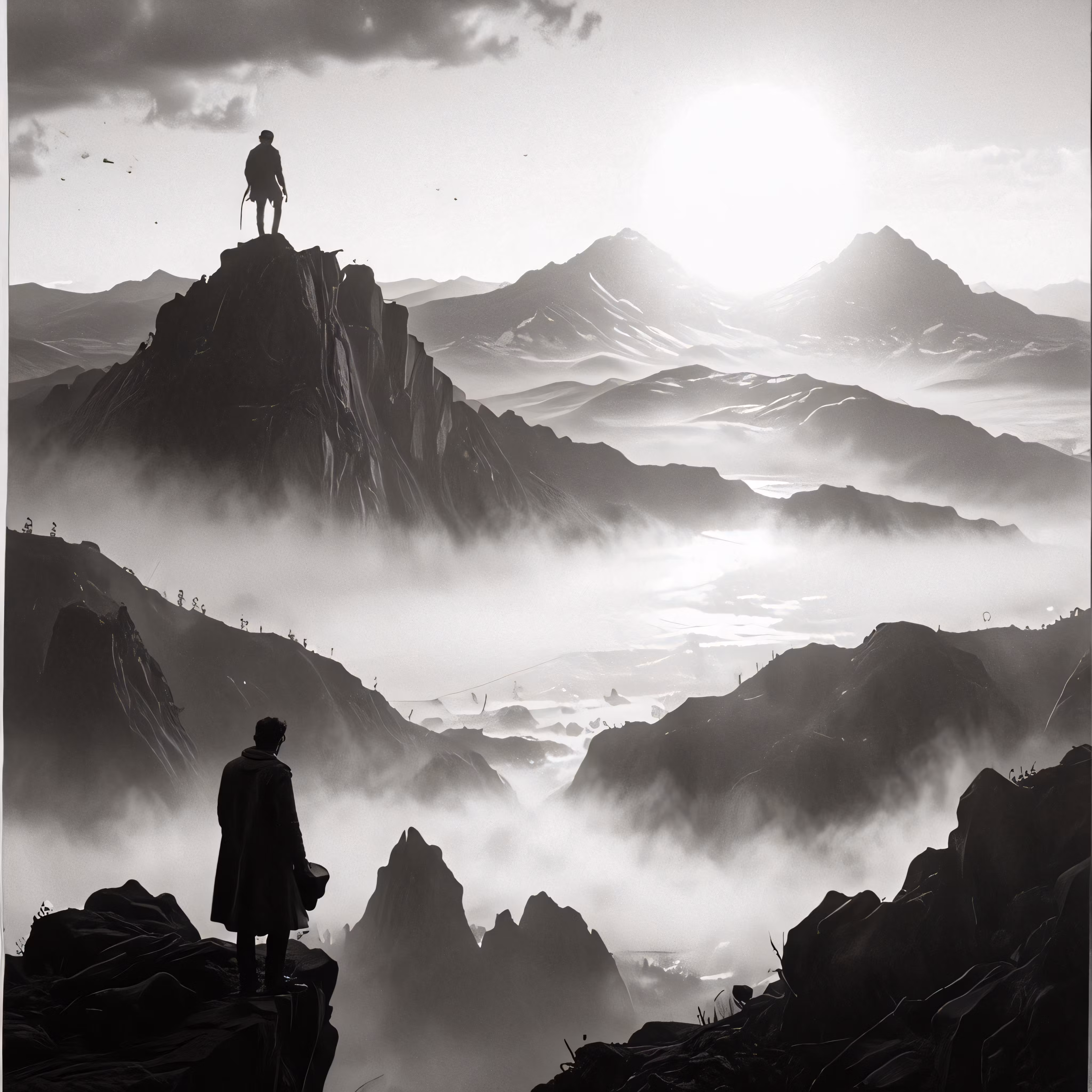 High resolution picture, free to use, a person standing at the top of a mountain looking out at the clouds