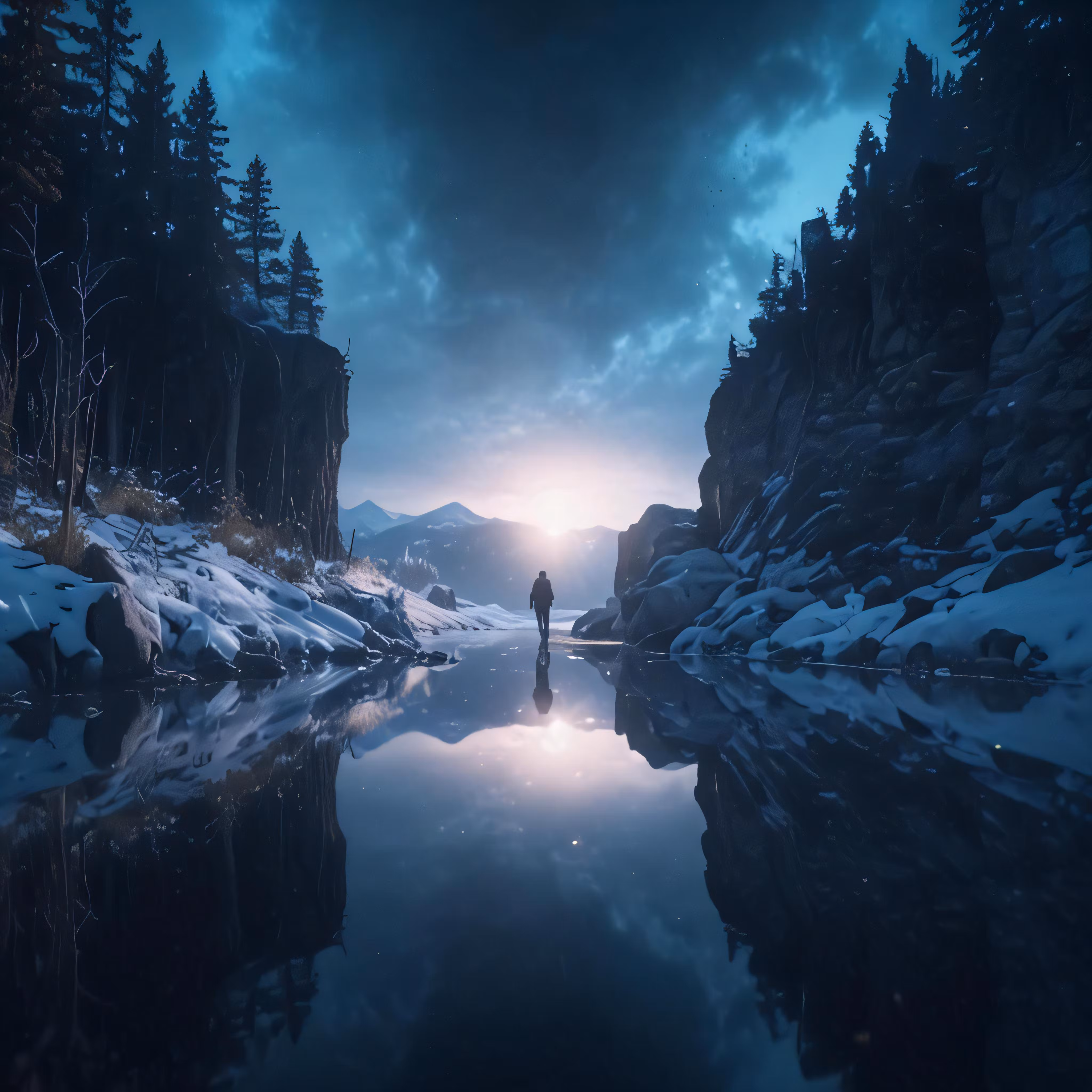 High resolution picture, free to use, a person standing in a snowy forest looking at the water