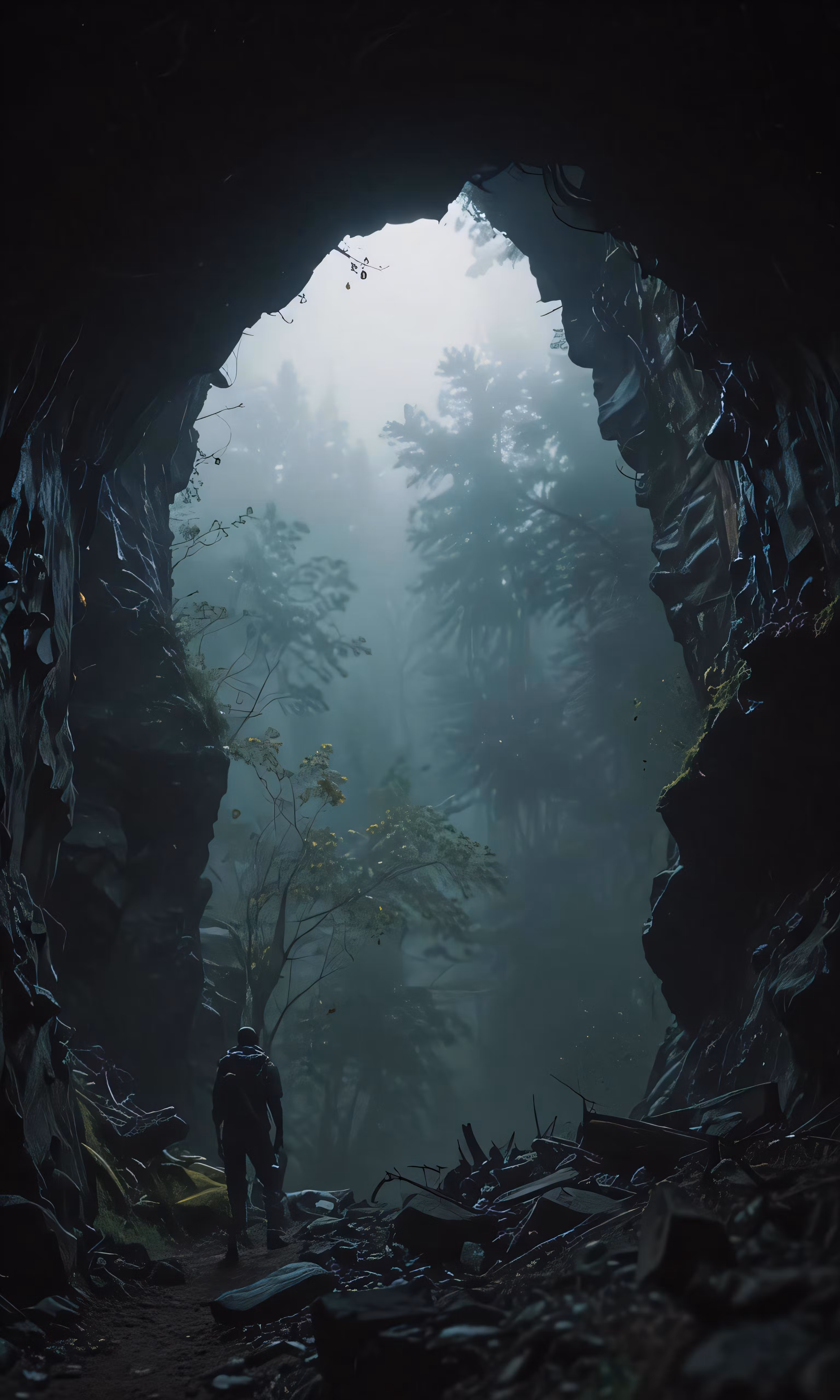 High resolution picture, free to use, a person standing in front of a large cave entrance