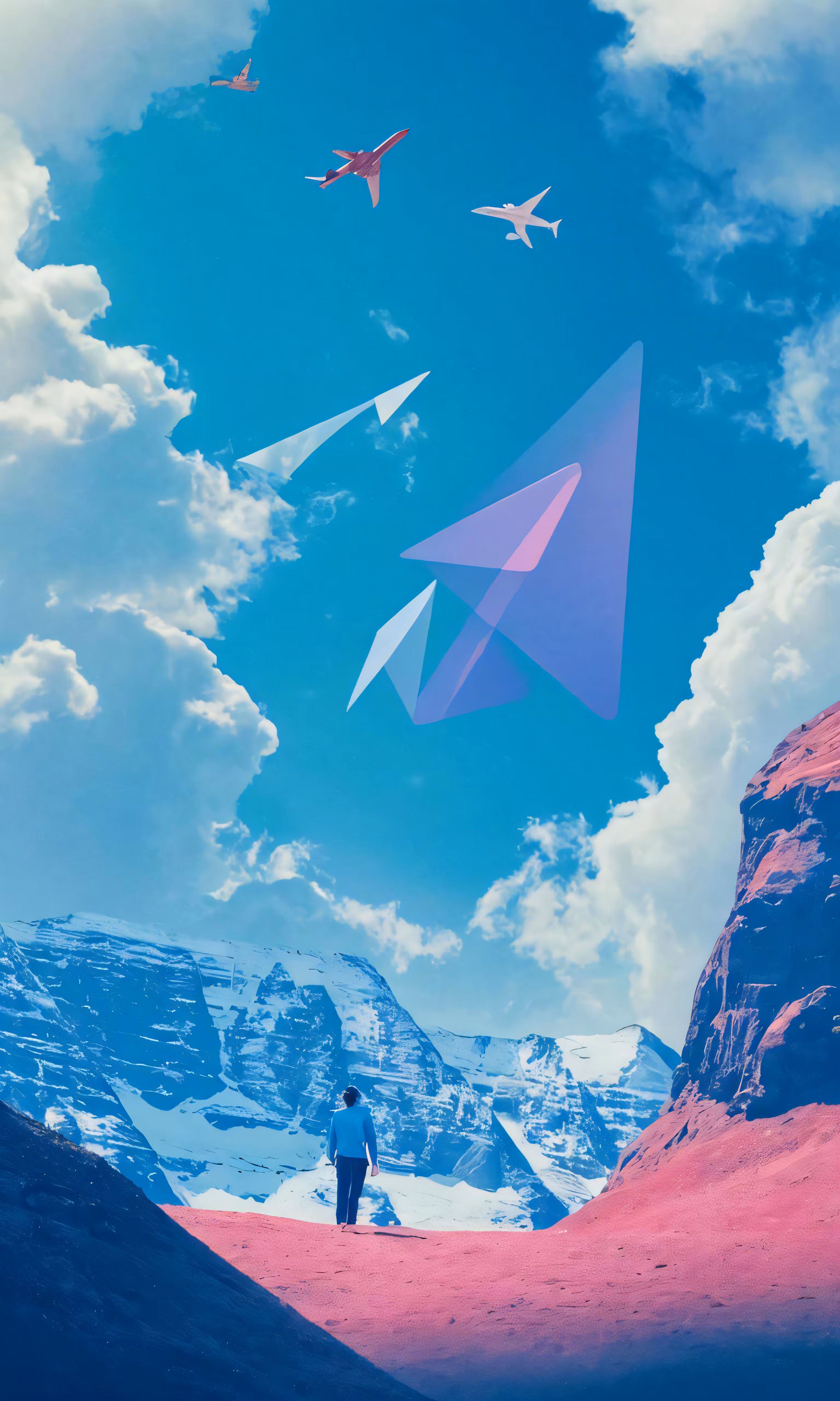 High resolution picture, free to use, a person standing in front of mountains and flying a kite