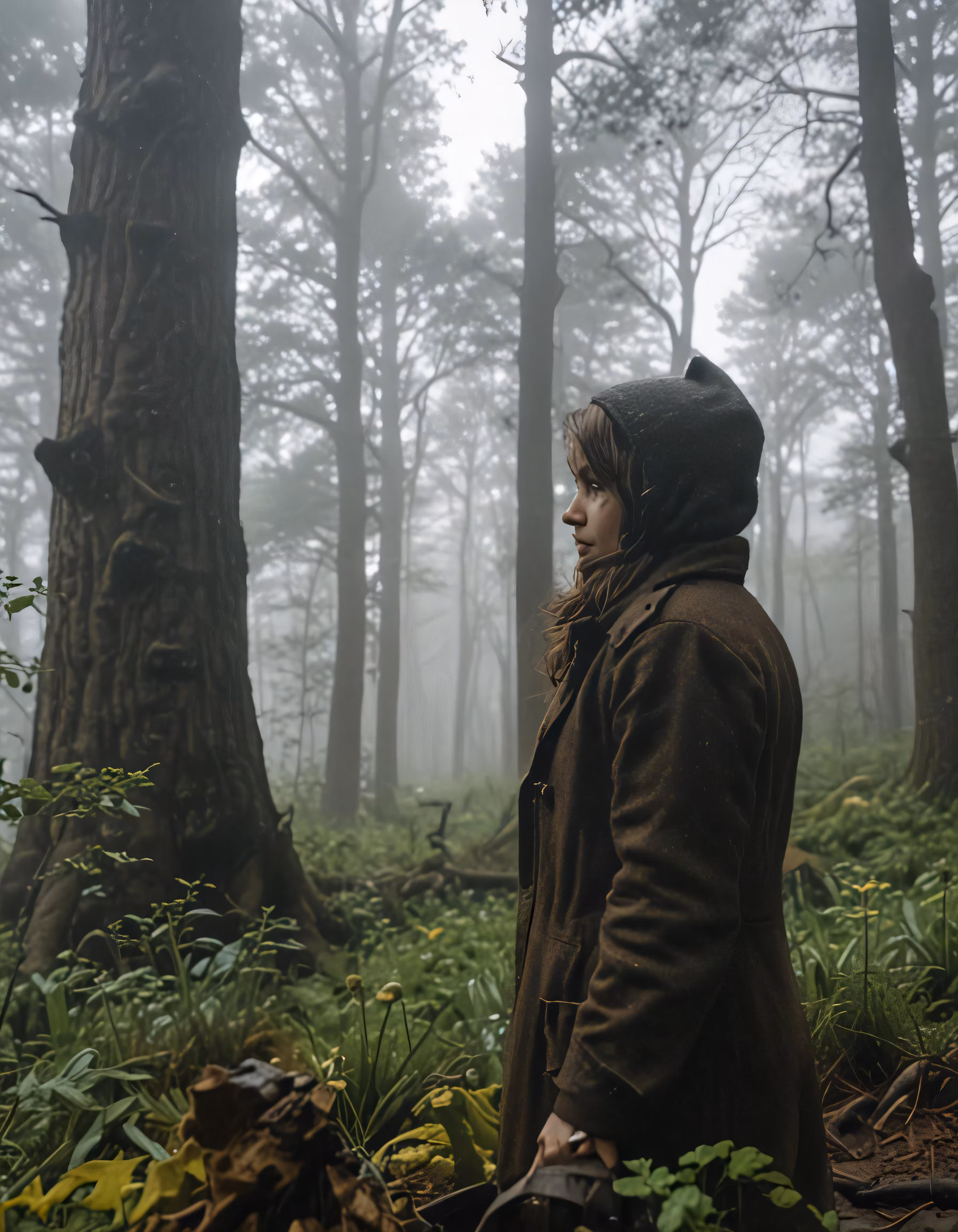 High resolution picture, free to use, a person standing in front of two trees and wearing a coat