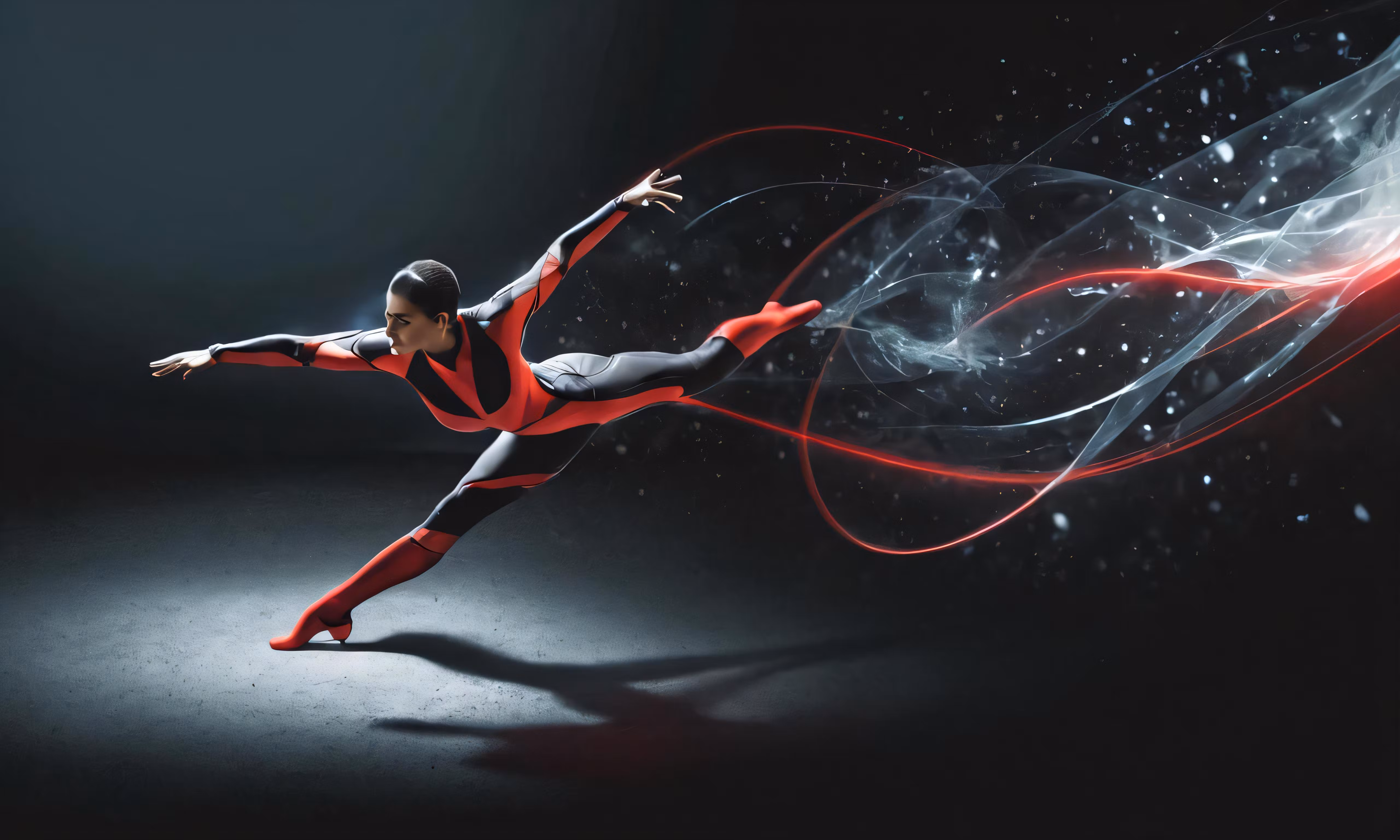 High resolution picture, free to use, a person standing in the air with one foot outstretched and arms spread out