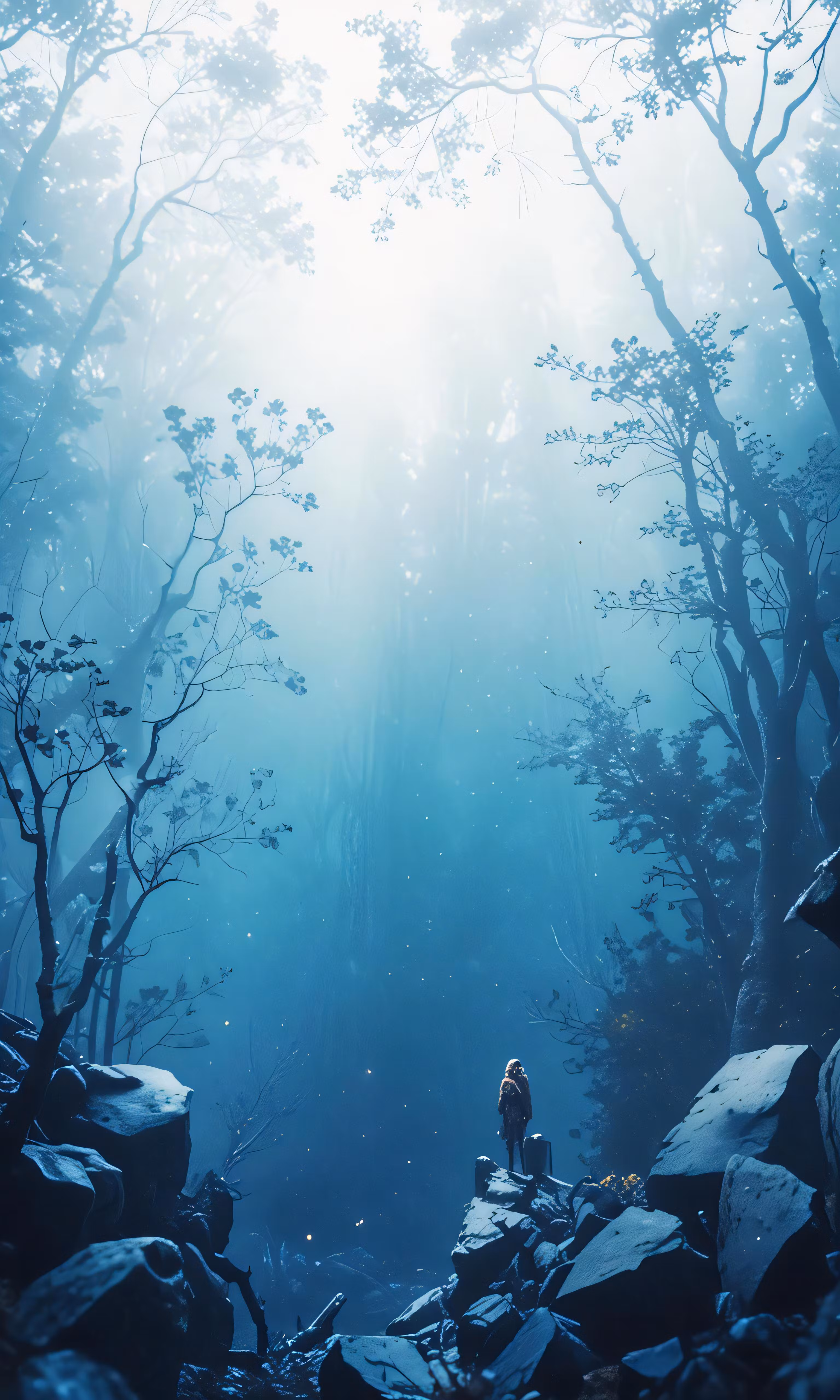 High resolution picture, free to use, a person standing in the woods by some rocks