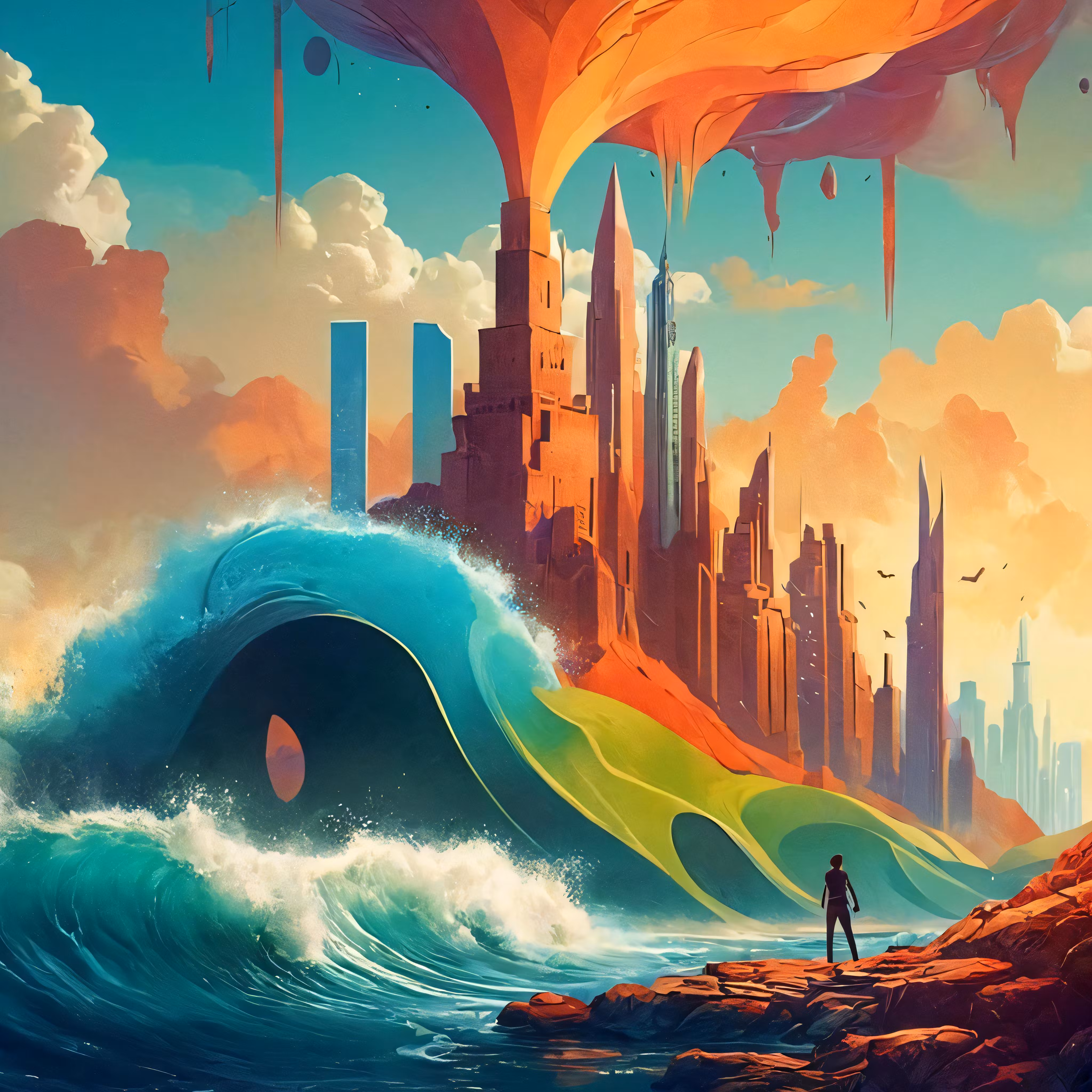 High resolution picture, free to use, a person standing next to an ocean in front of a city with many tall buildings