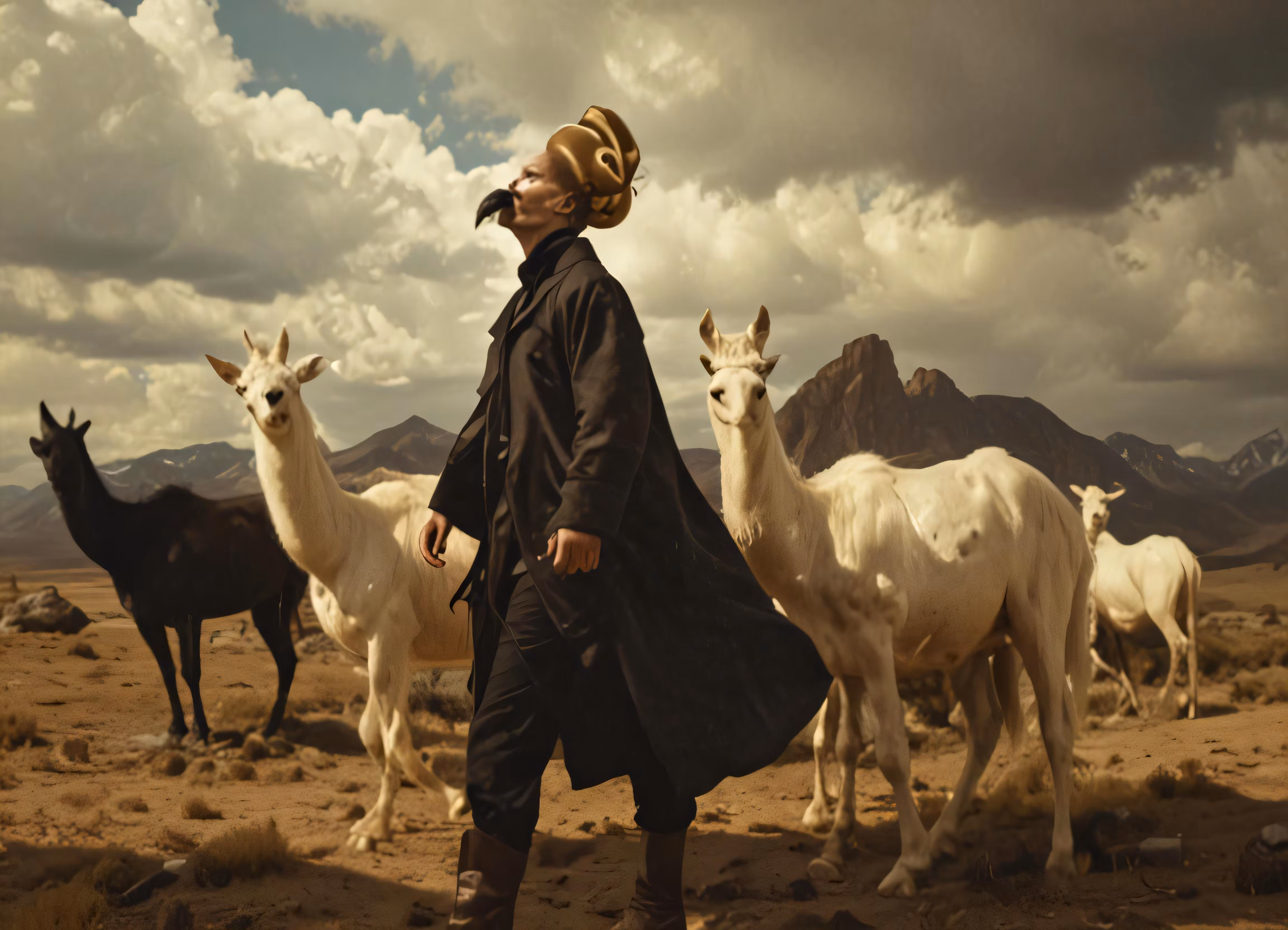 High resolution picture, free to use, a person standing next to some animals in the middle of nowhere
