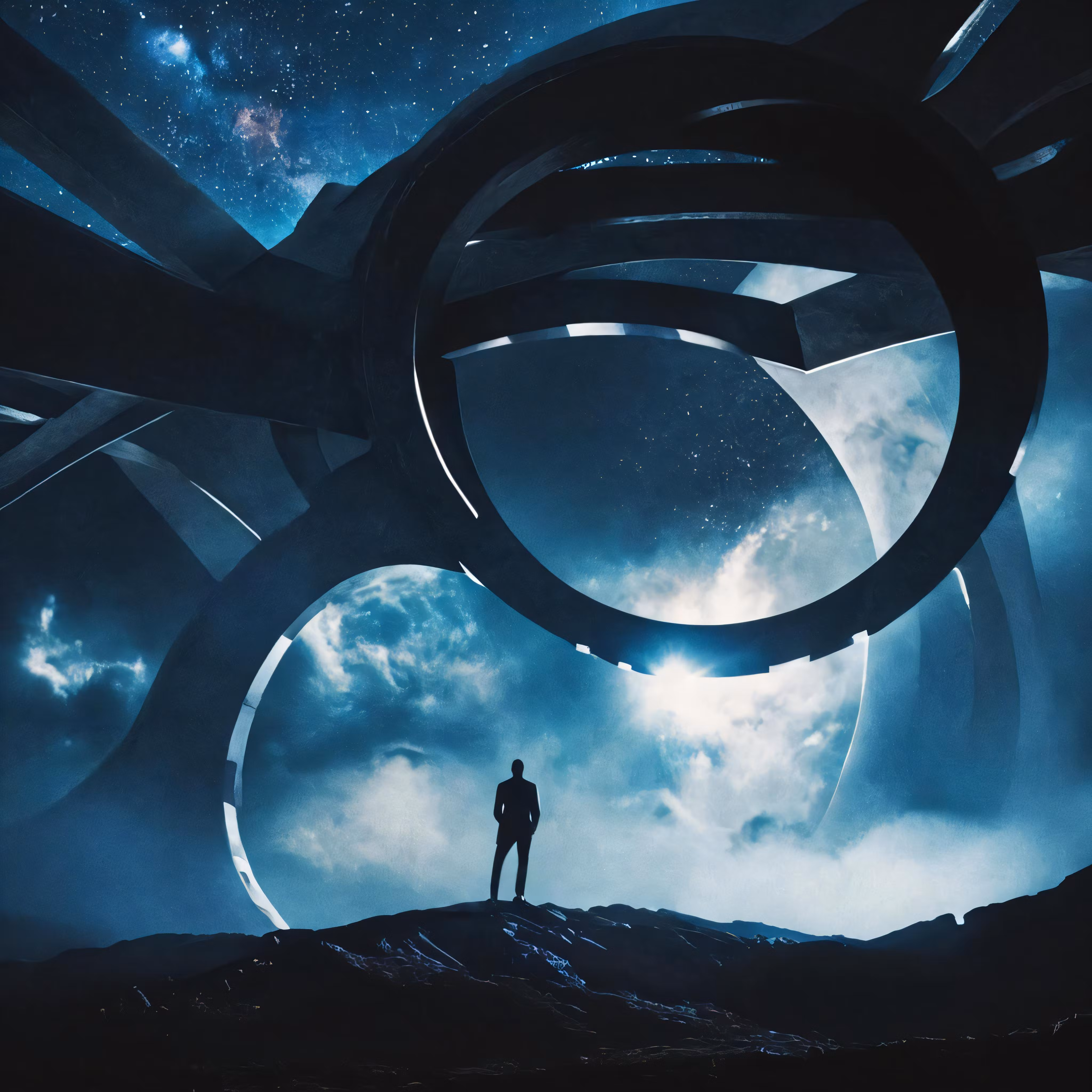 High resolution picture, free to use, a person stands under a star filled sky with a giant metal spiral around them