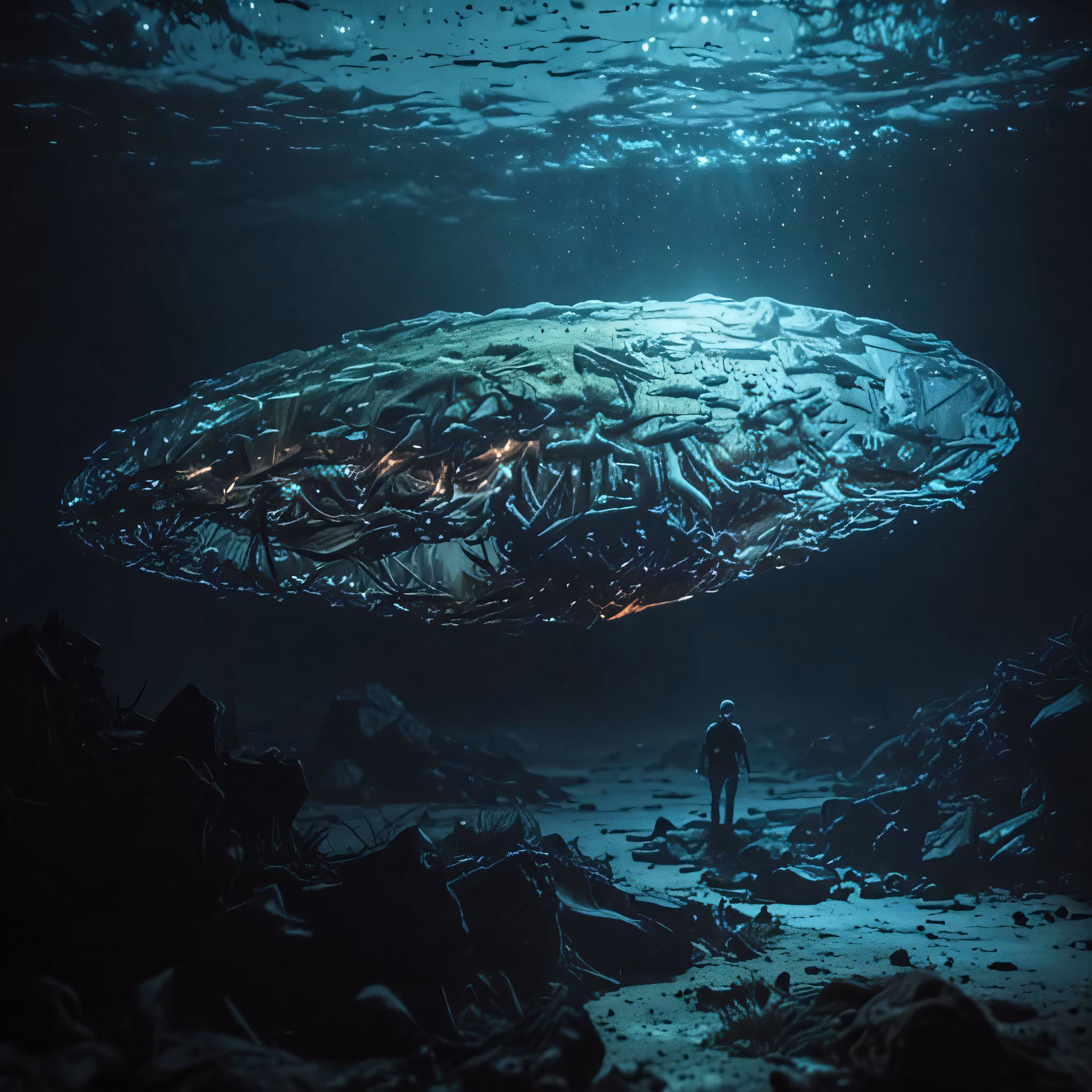 High resolution picture, free to use, a person under the water in front of a massive object
