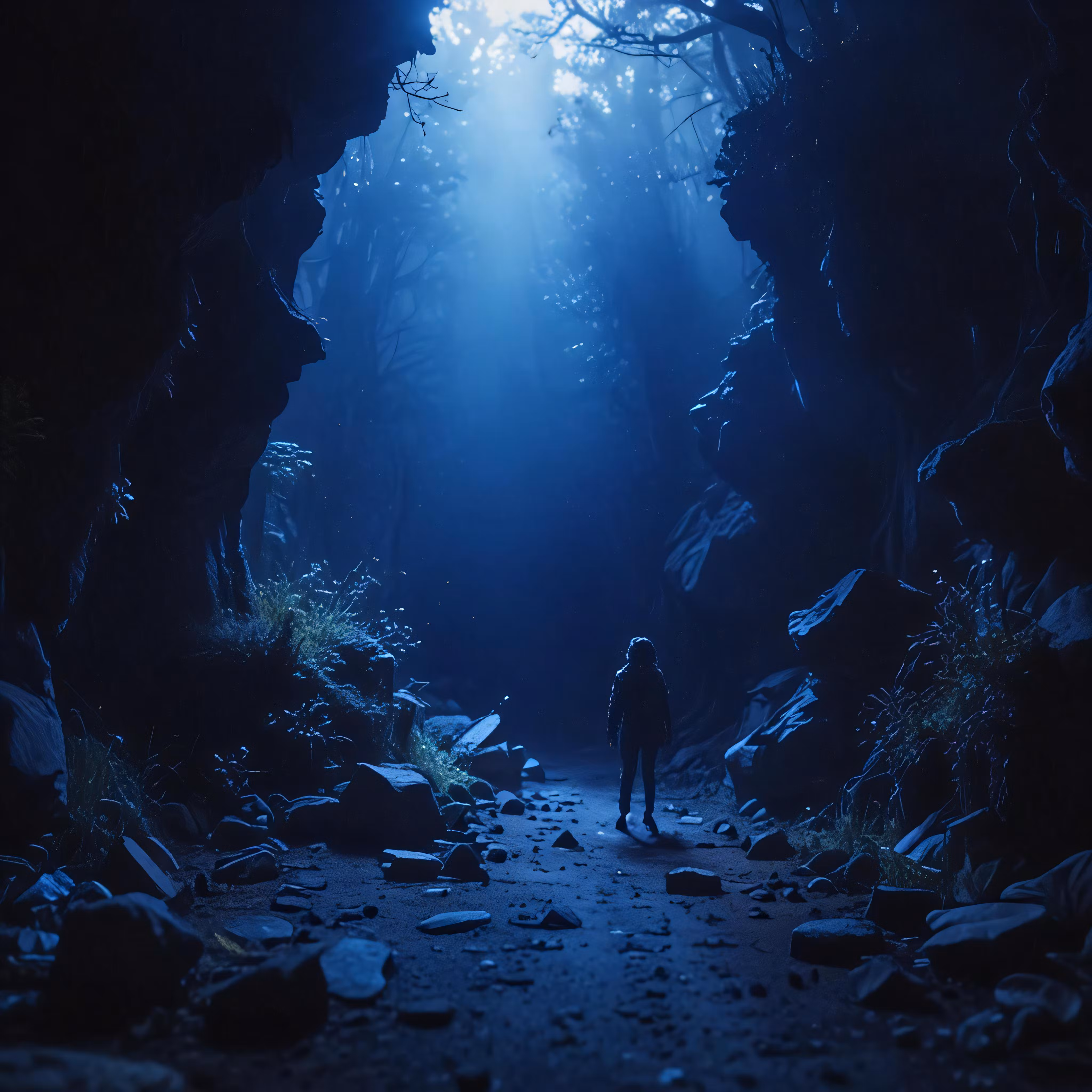 High resolution picture, free to use, a person walking down a trail with sunlight coming through the tunnel