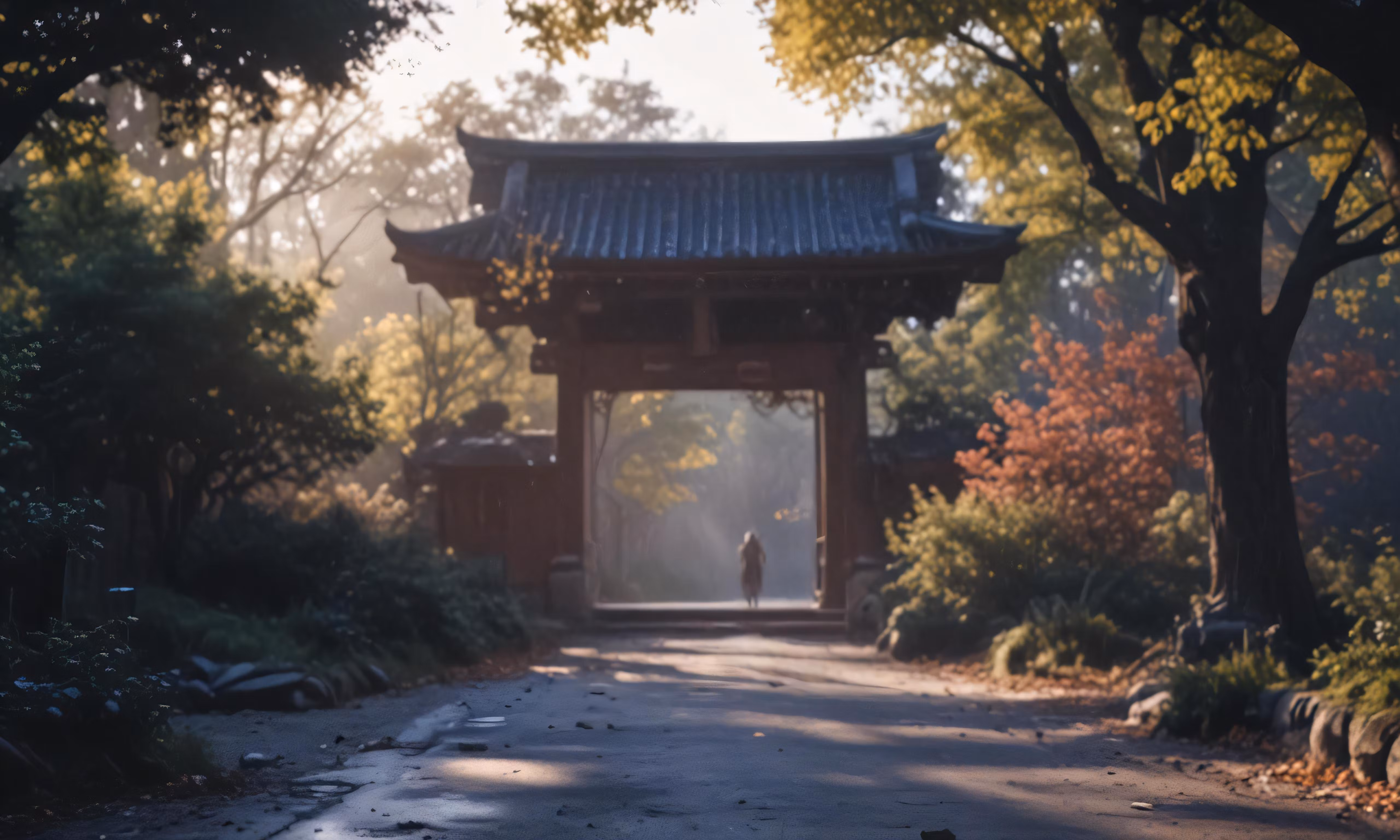 High resolution picture, free to use, a person walking through an outdoor walkway that has many trees