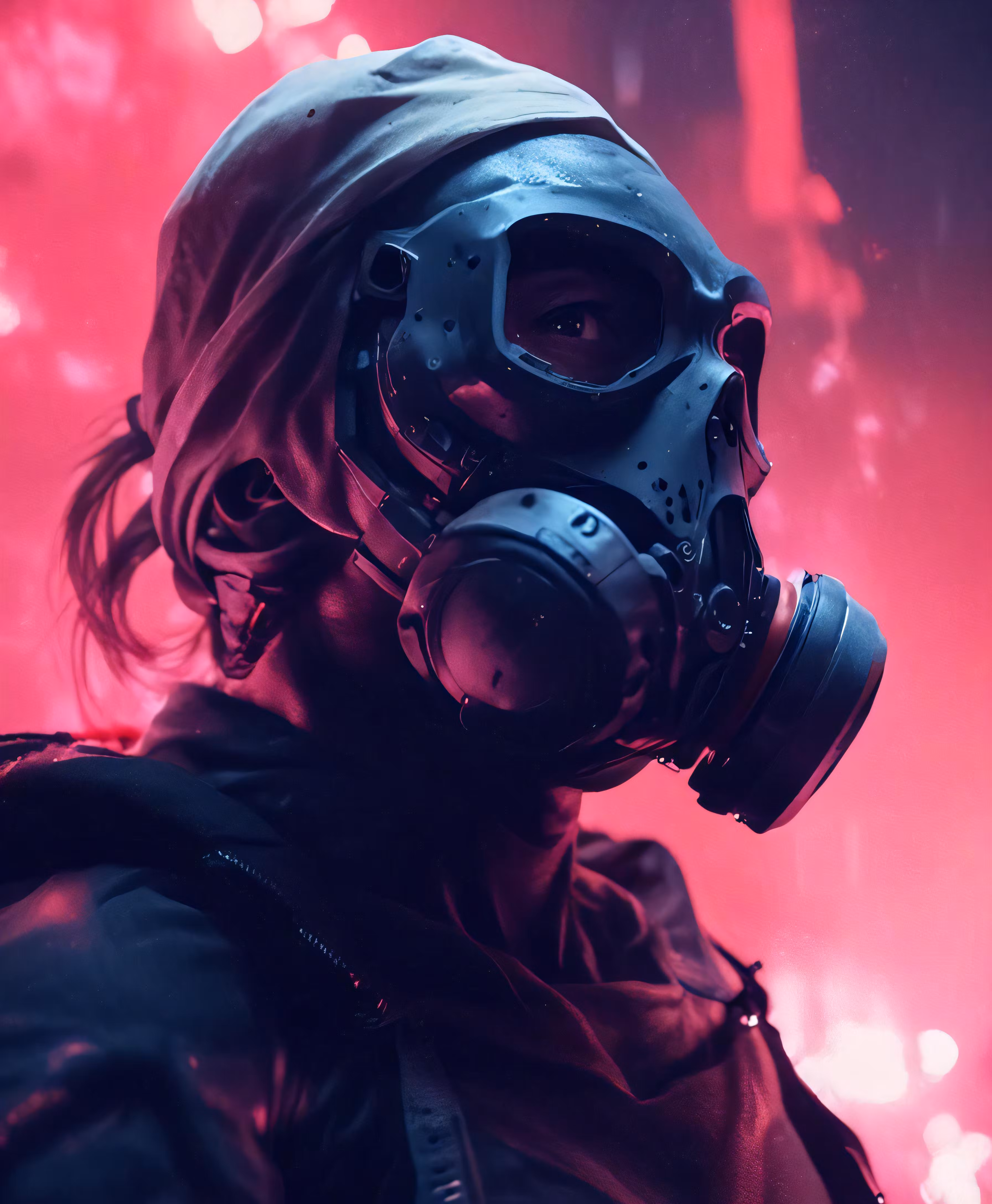 High resolution picture, free to use, a person wearing a gas mask and looking at a fire
