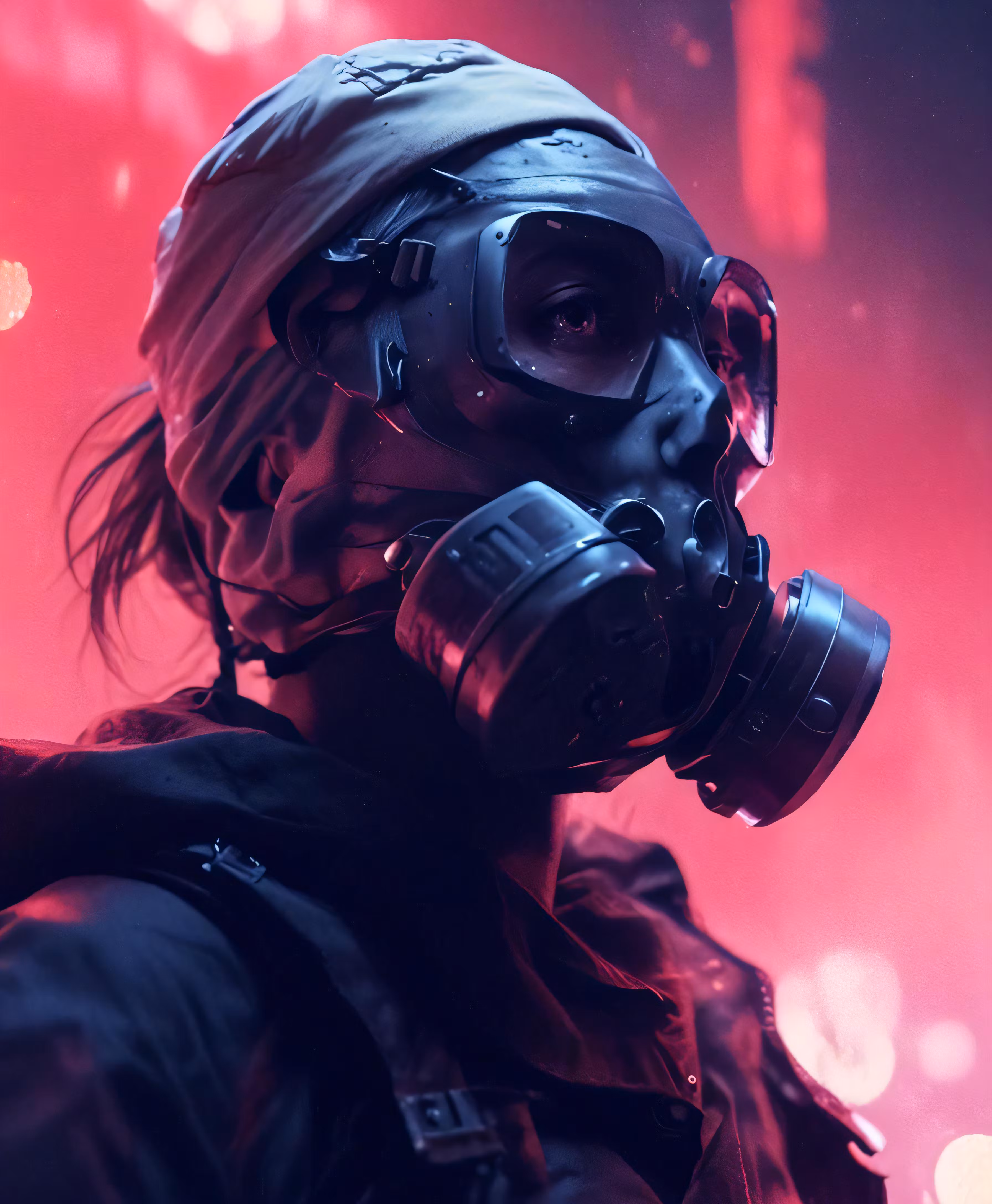 High resolution picture, free to use, a person wearing gas mask standing on top of a pink background