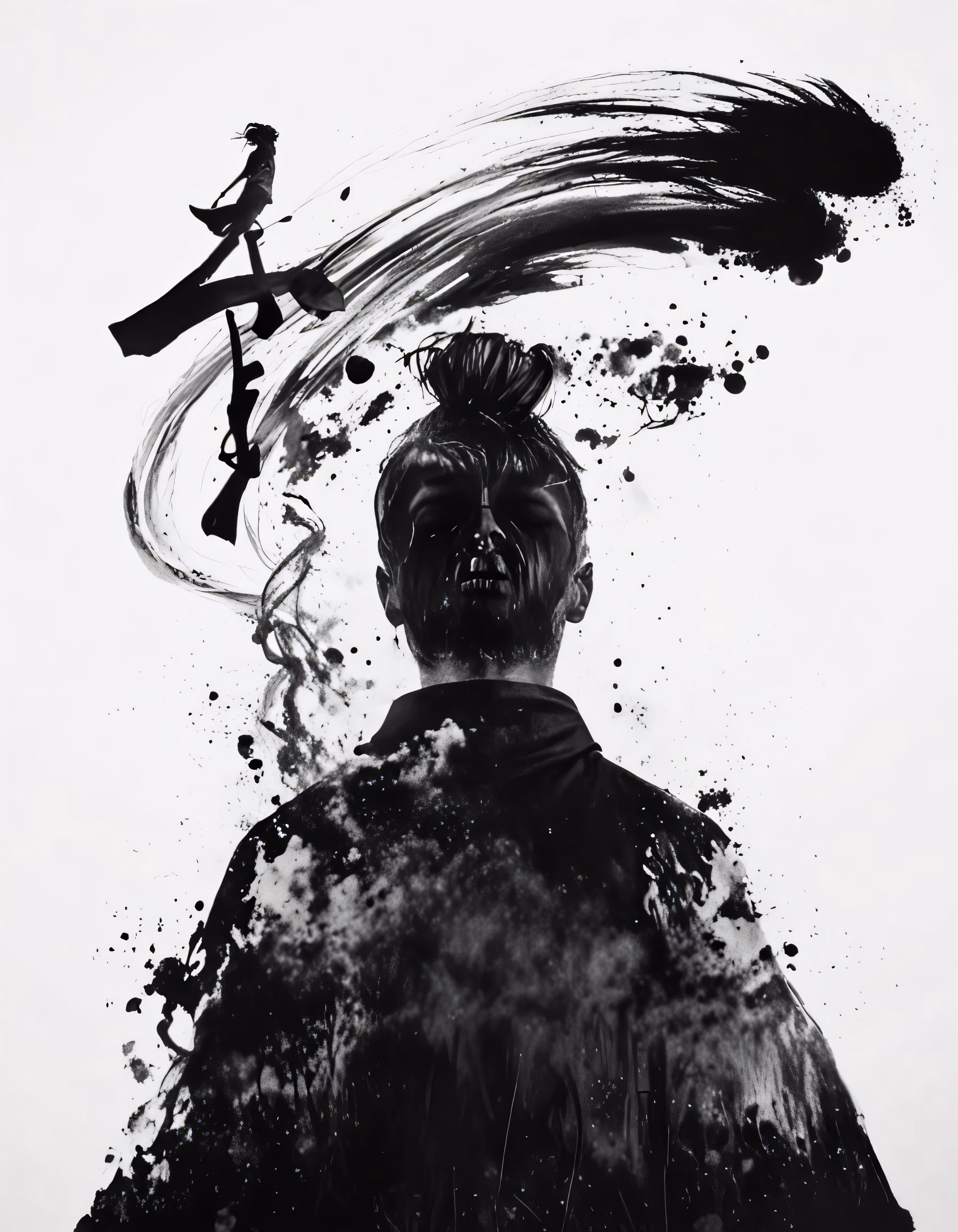 High resolution picture, free to use, a person with a black coat on, surrounded by ink splats
