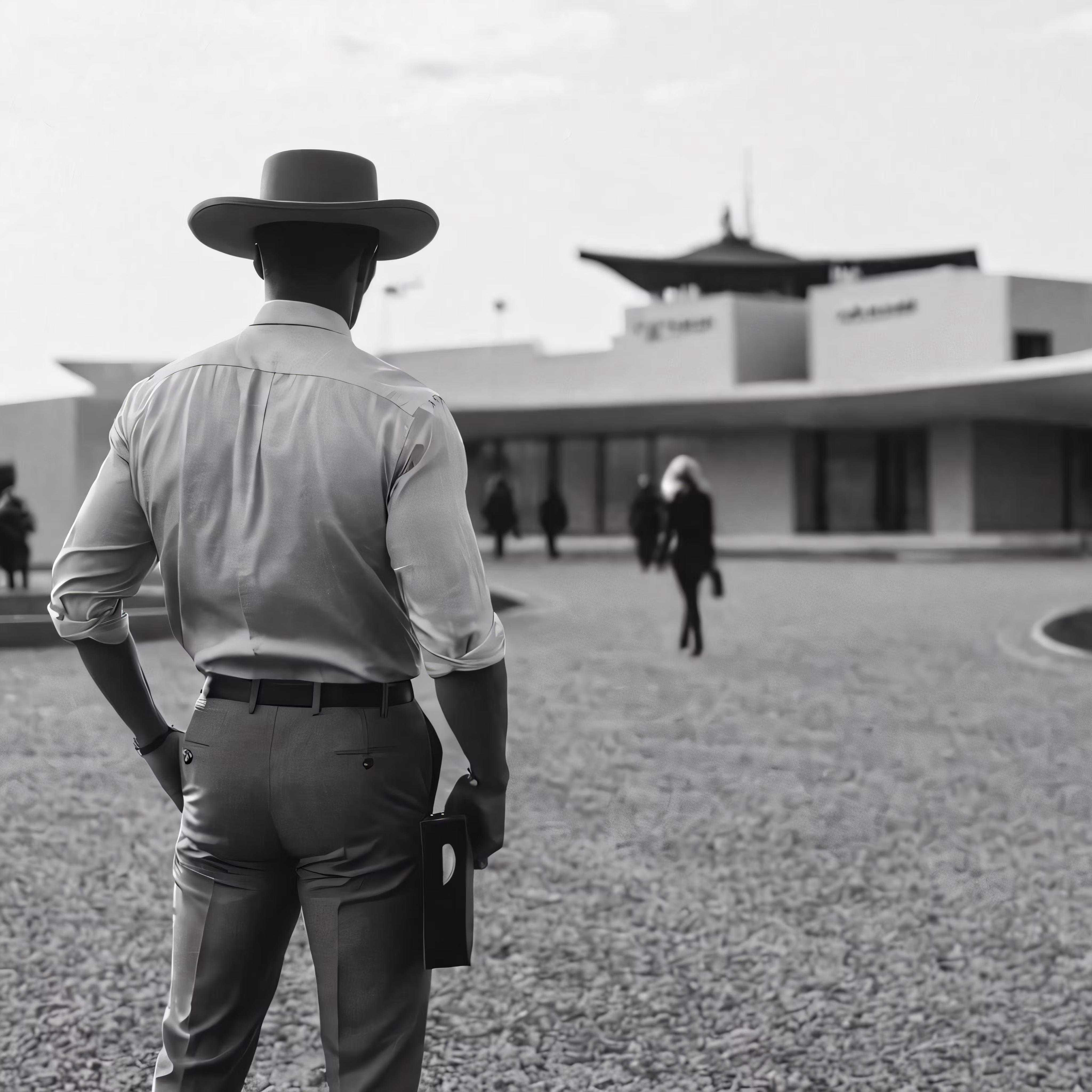 High resolution picture, free to use, a person with a cowboy hat looks at people walking in the background