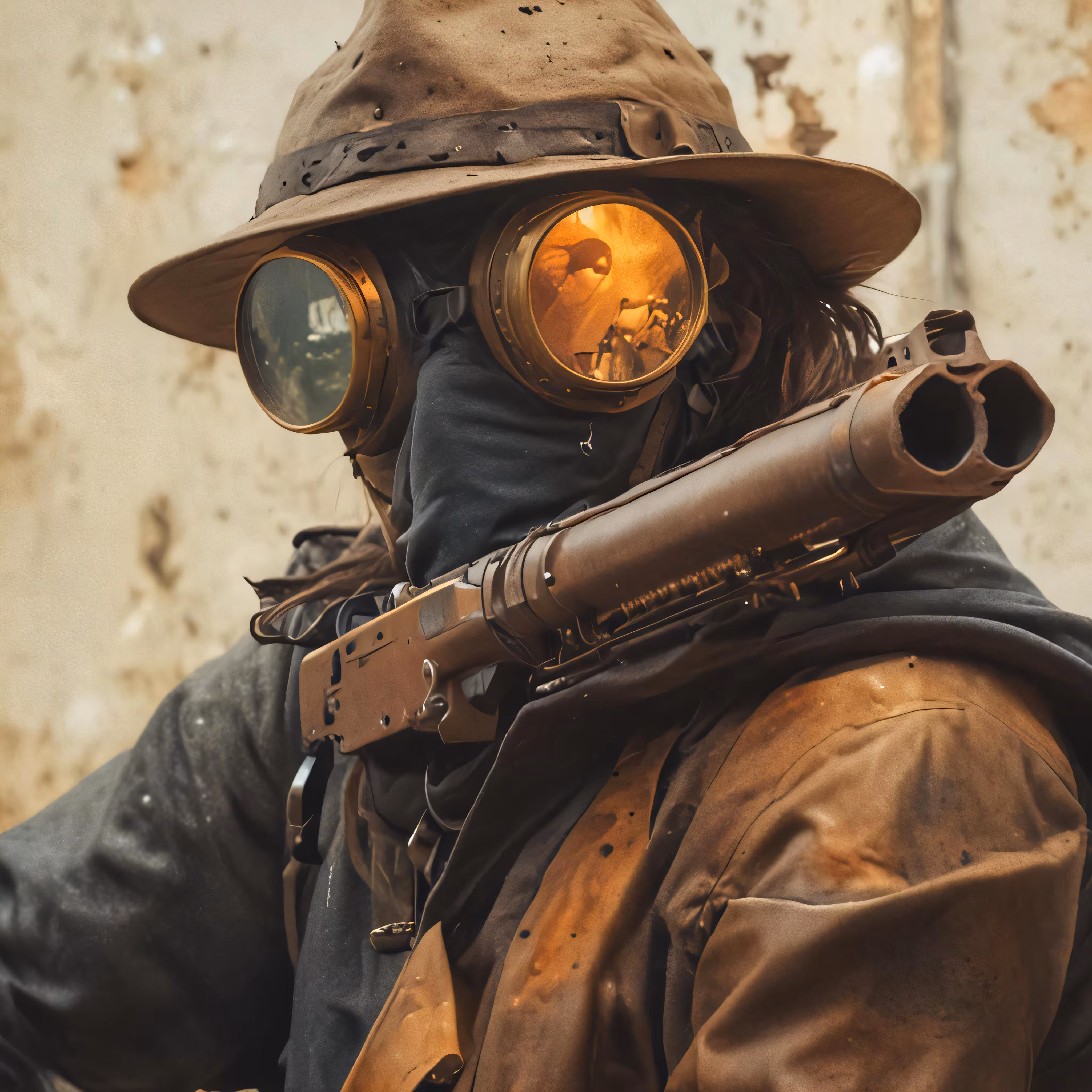 High resolution picture, free to use, a person with a hat and gas mask holding a rifle