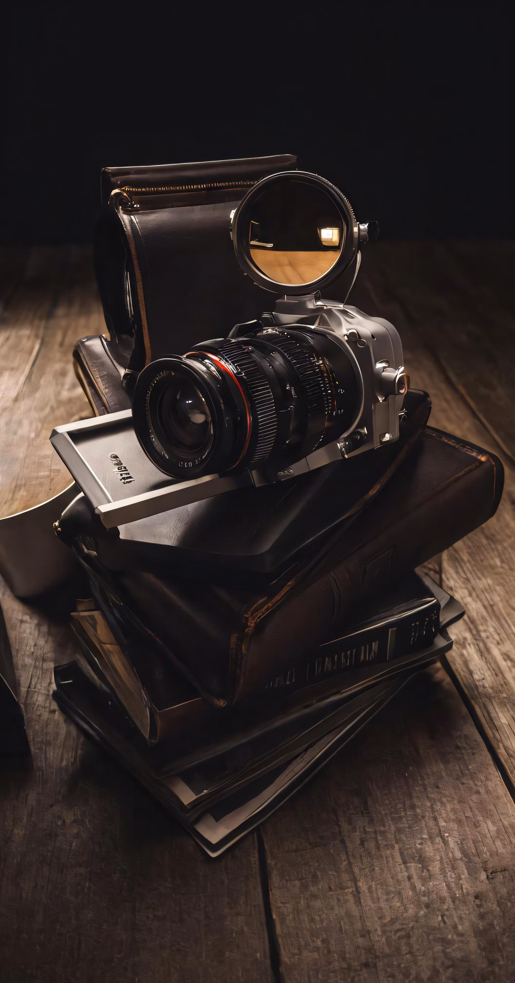 High resolution picture, free to use, a photo camera on top of a stack of books