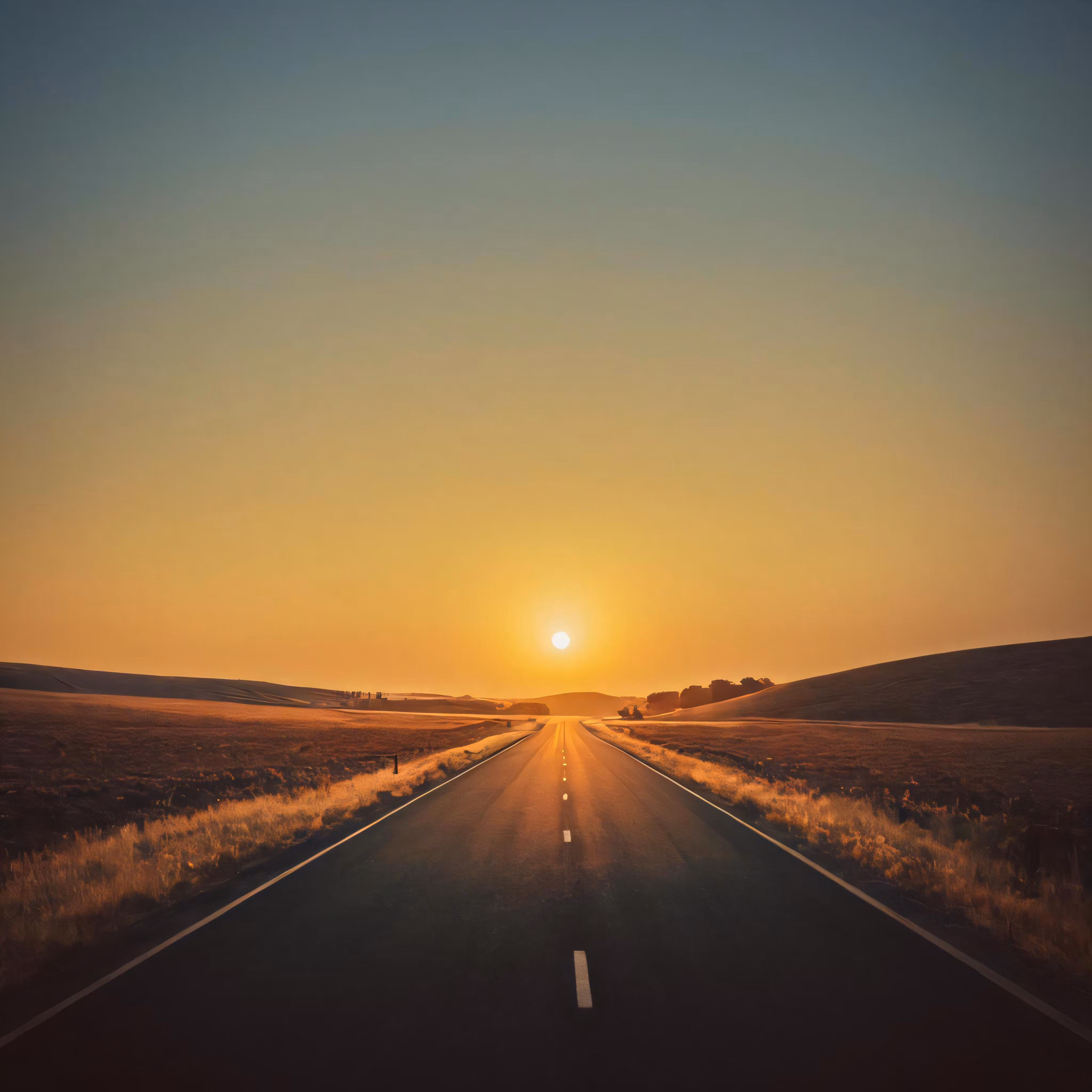 High resolution picture, free to use, a photo of an empty road with the sun in the distance