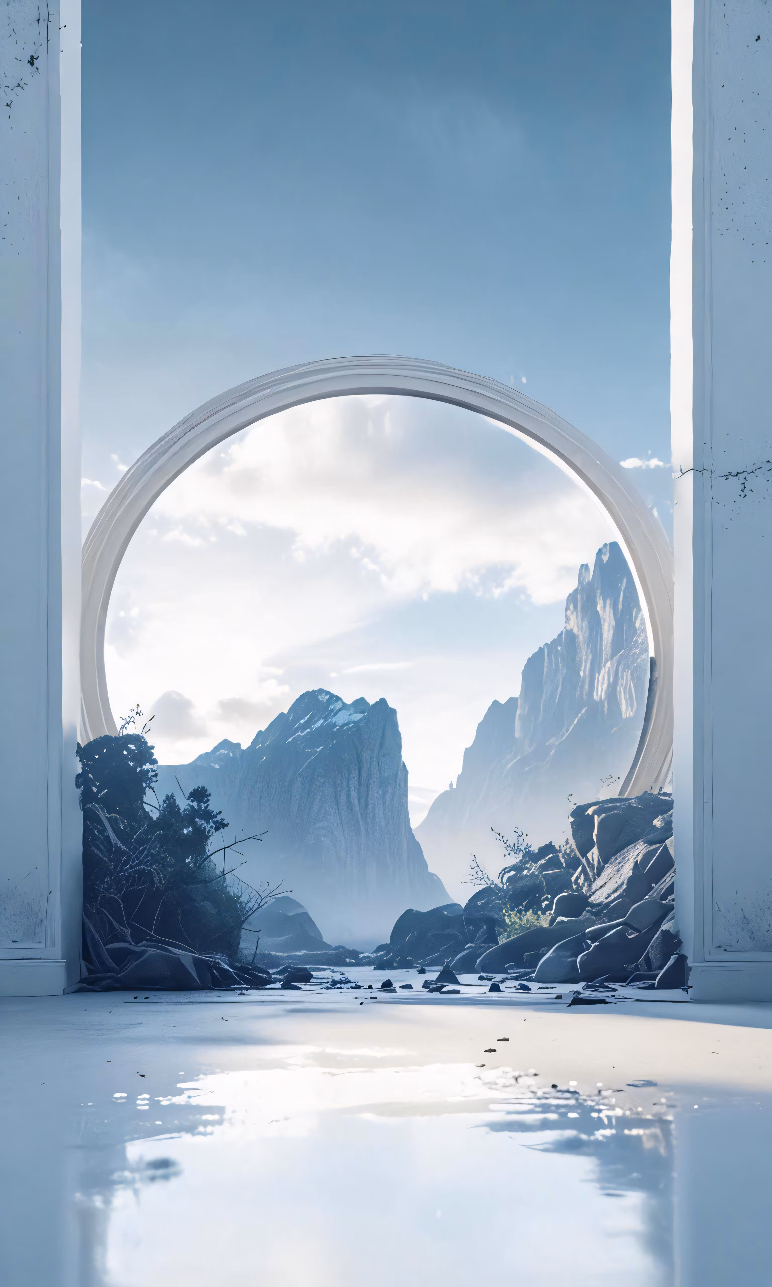 High resolution picture, free to use, a photograph taken through an open door to a mountain