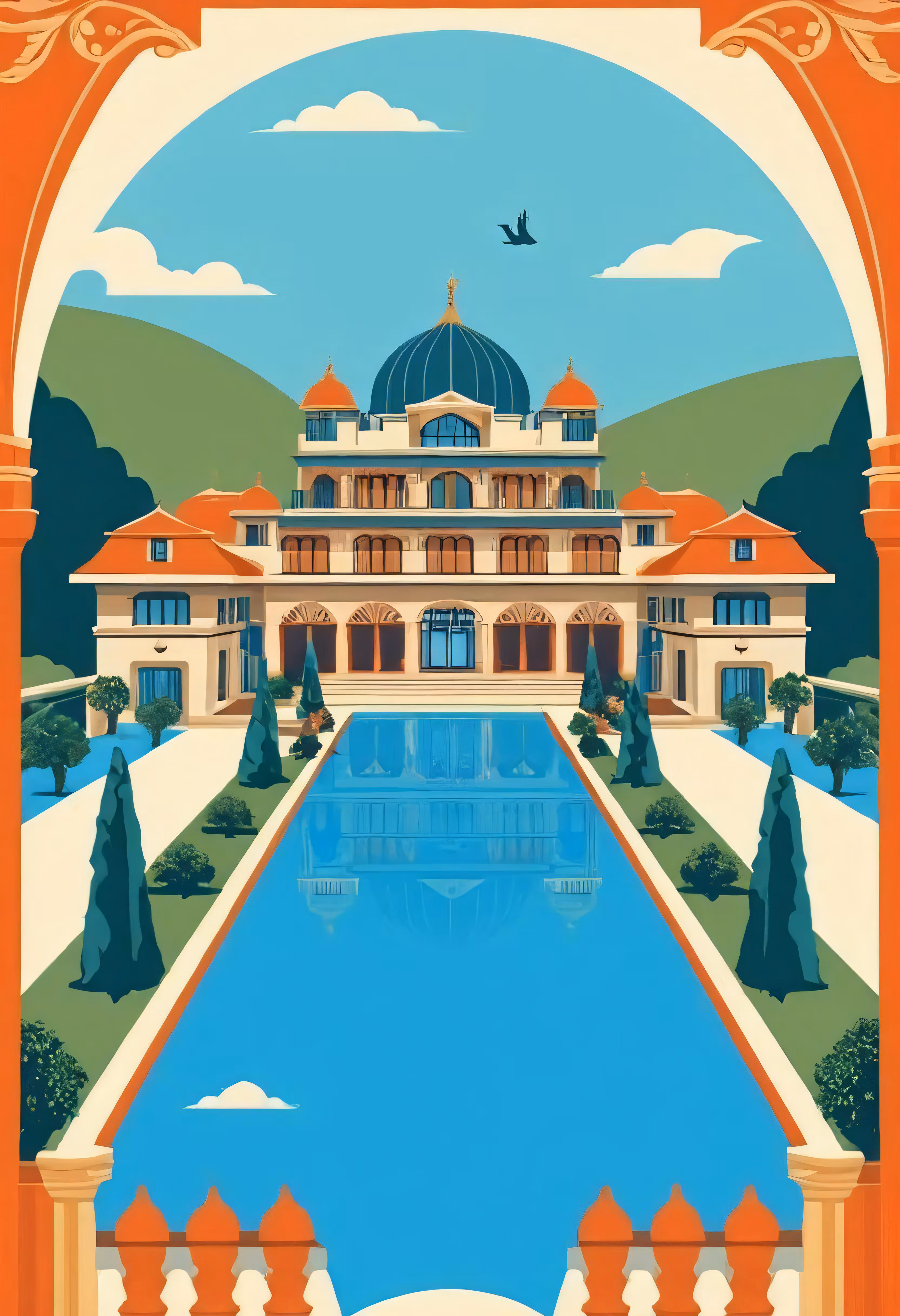 High resolution picture, free to use, a picture of a big mansion with water at the bottom