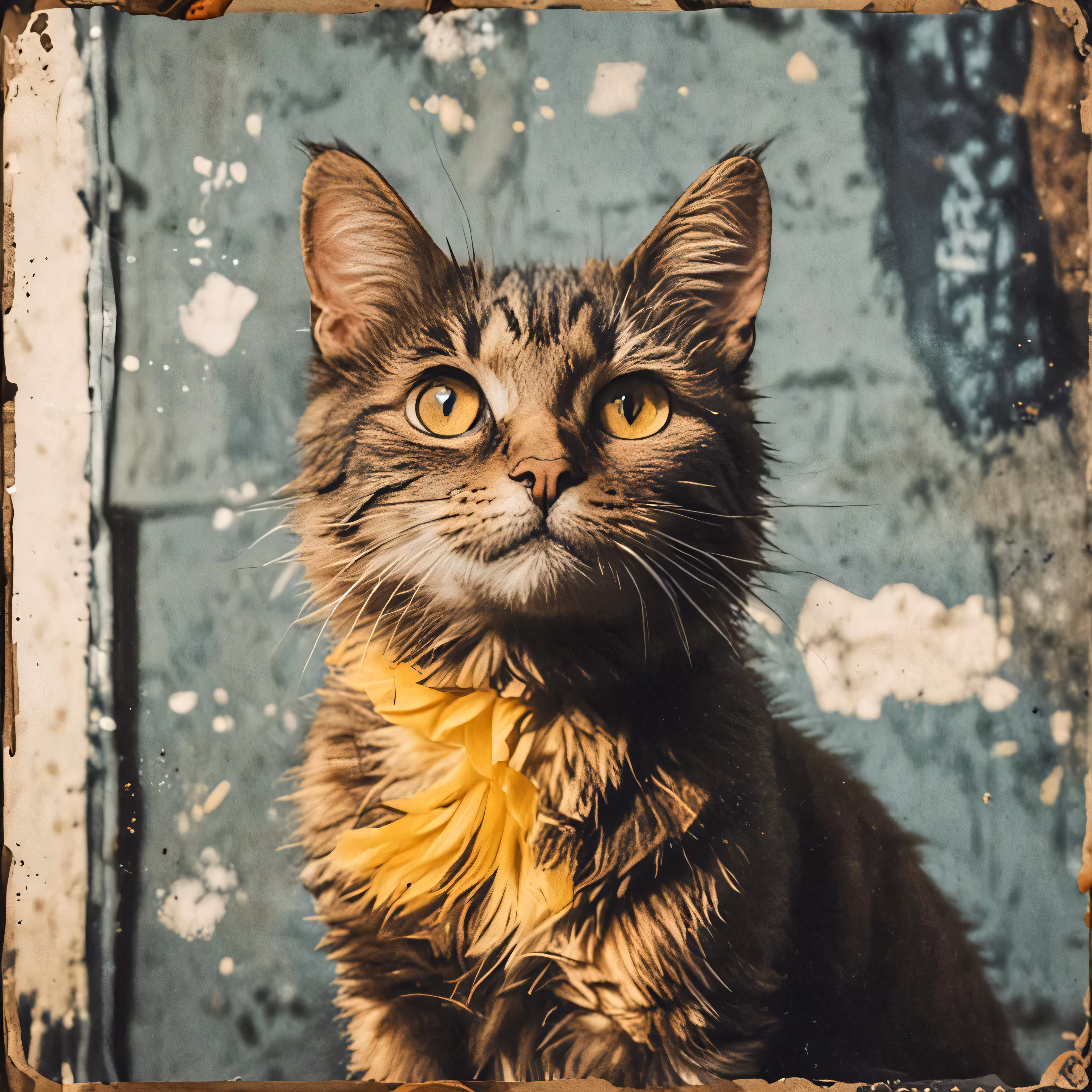 High resolution picture, free to use, a picture of a cat in yellow ribbon looking at something