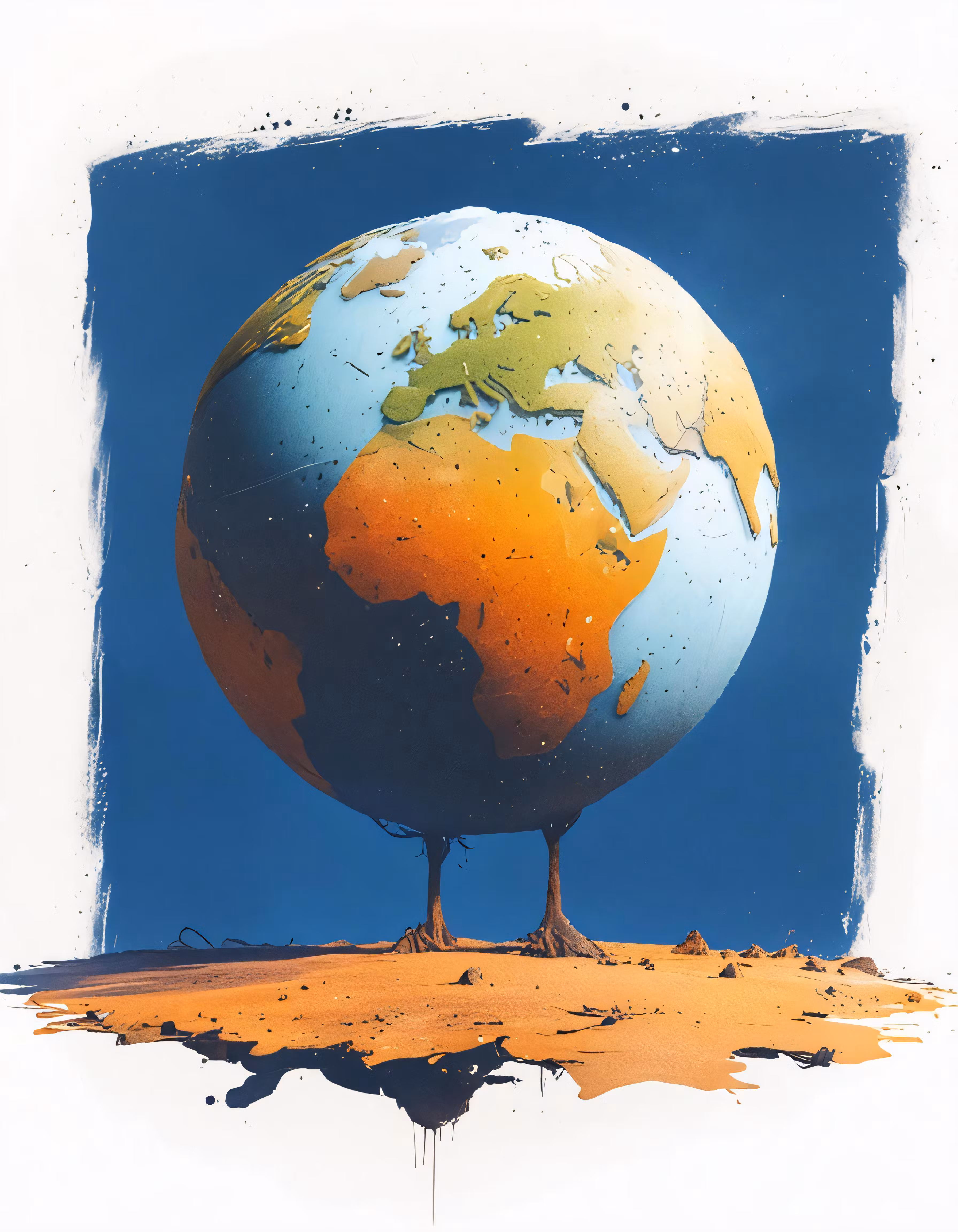 High resolution picture, free to use, a picture of a tree on top of a desert area with a picture of the world standing out of it