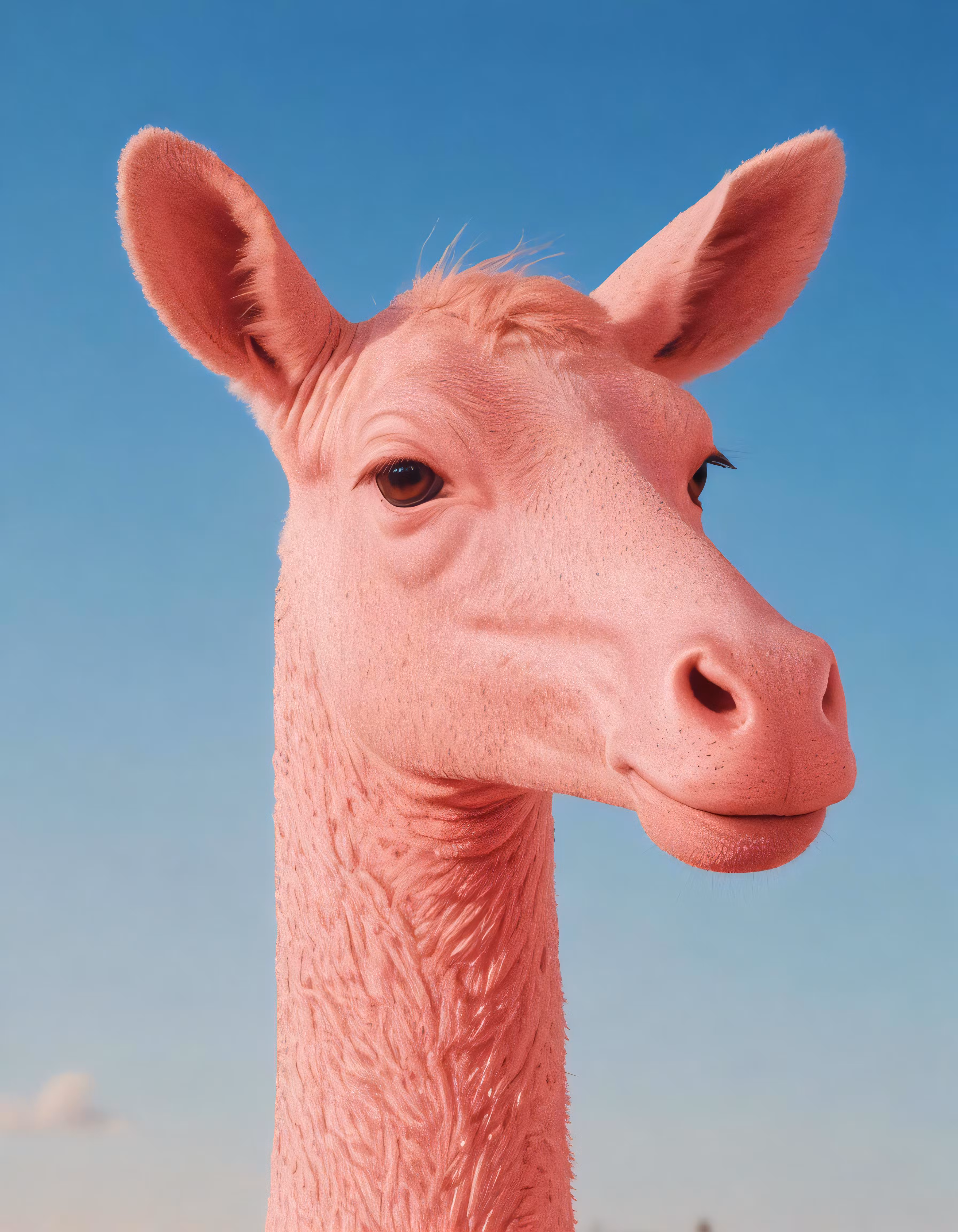 High resolution picture, free to use, a pink alpaca standing in front of a blue sky