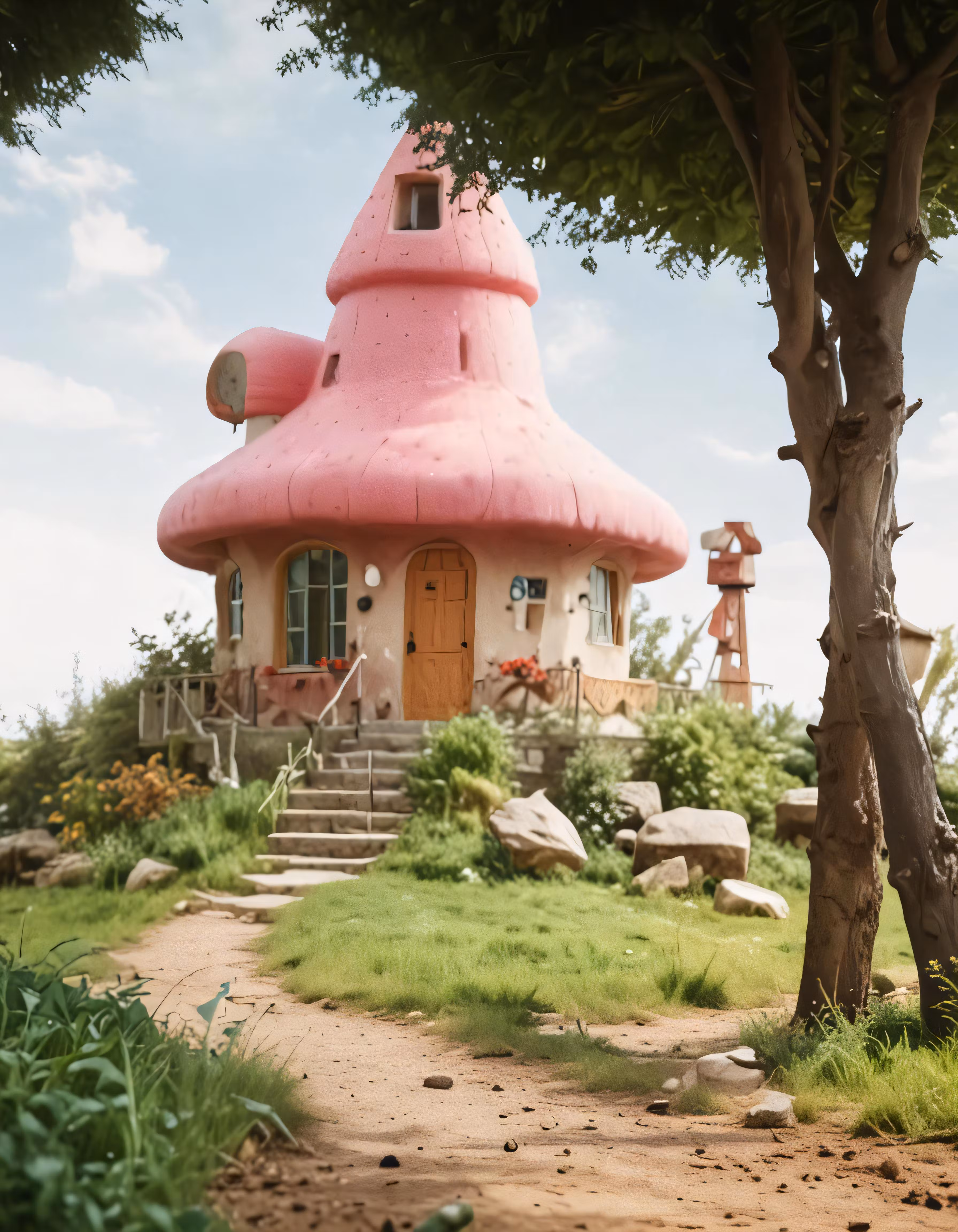 High resolution picture, free to use, a pink round building with a tree in front of it