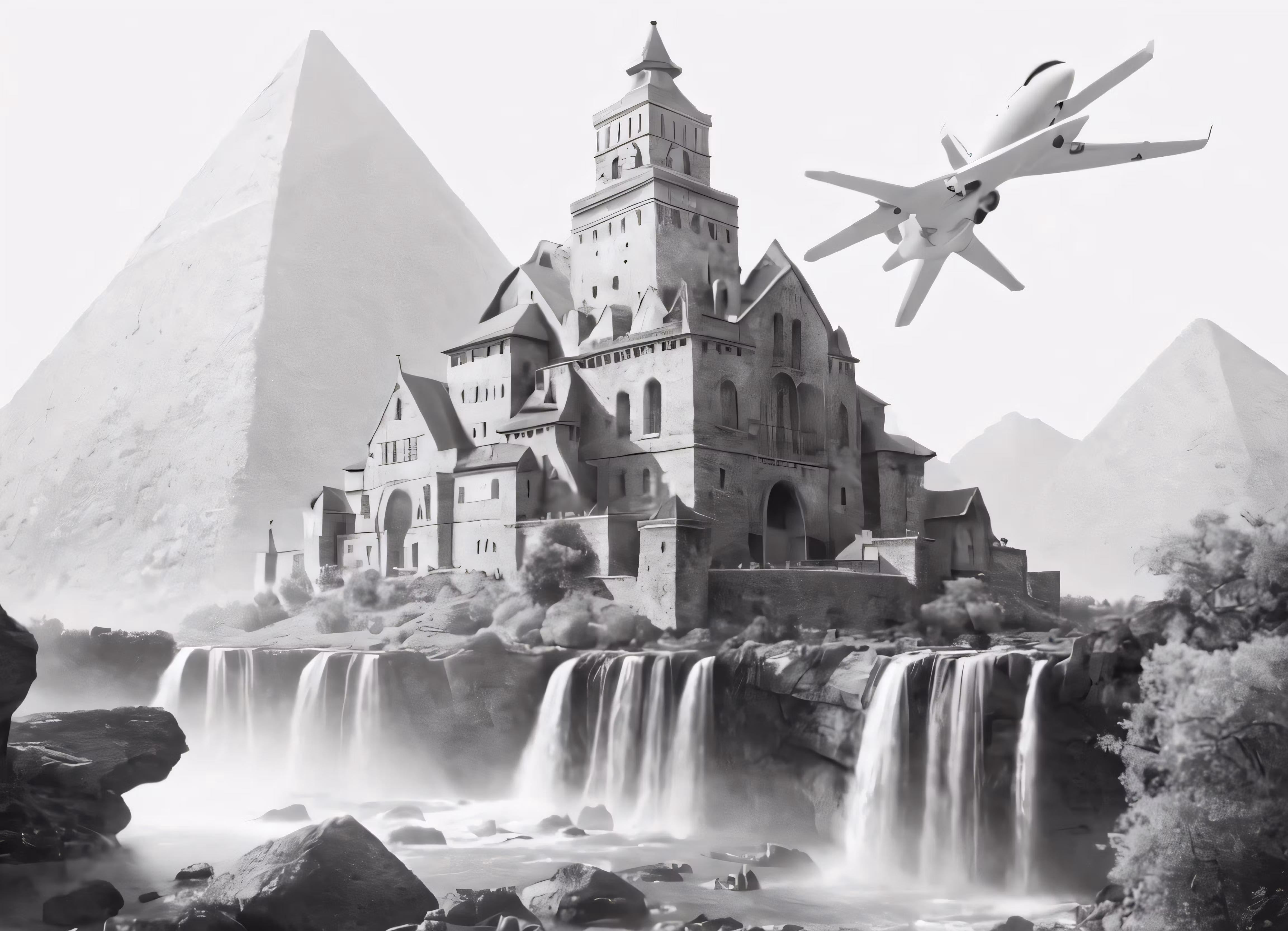 High resolution picture, free to use, a plane flying over a waterfall near a castle