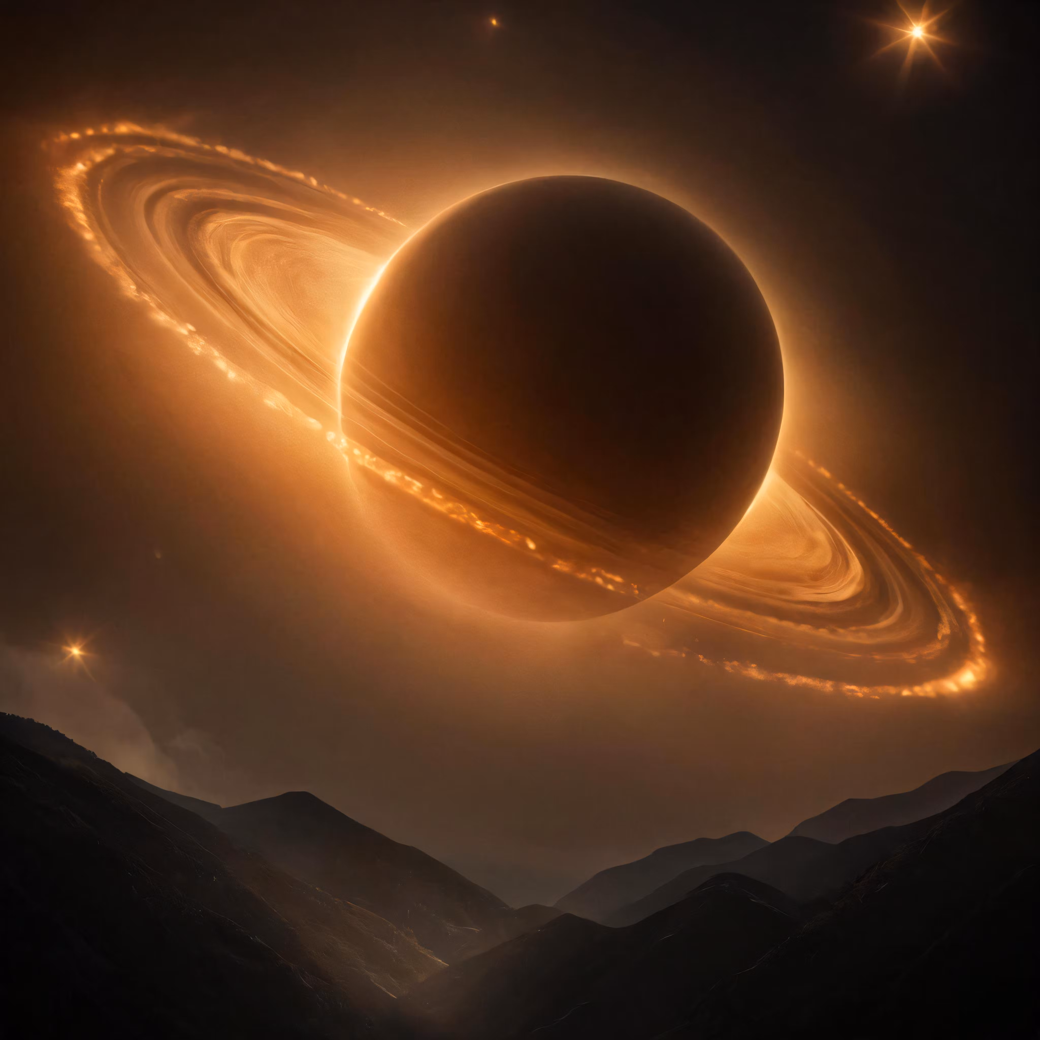 High resolution picture, free to use, a planet with a very long ring and lots of light around it
