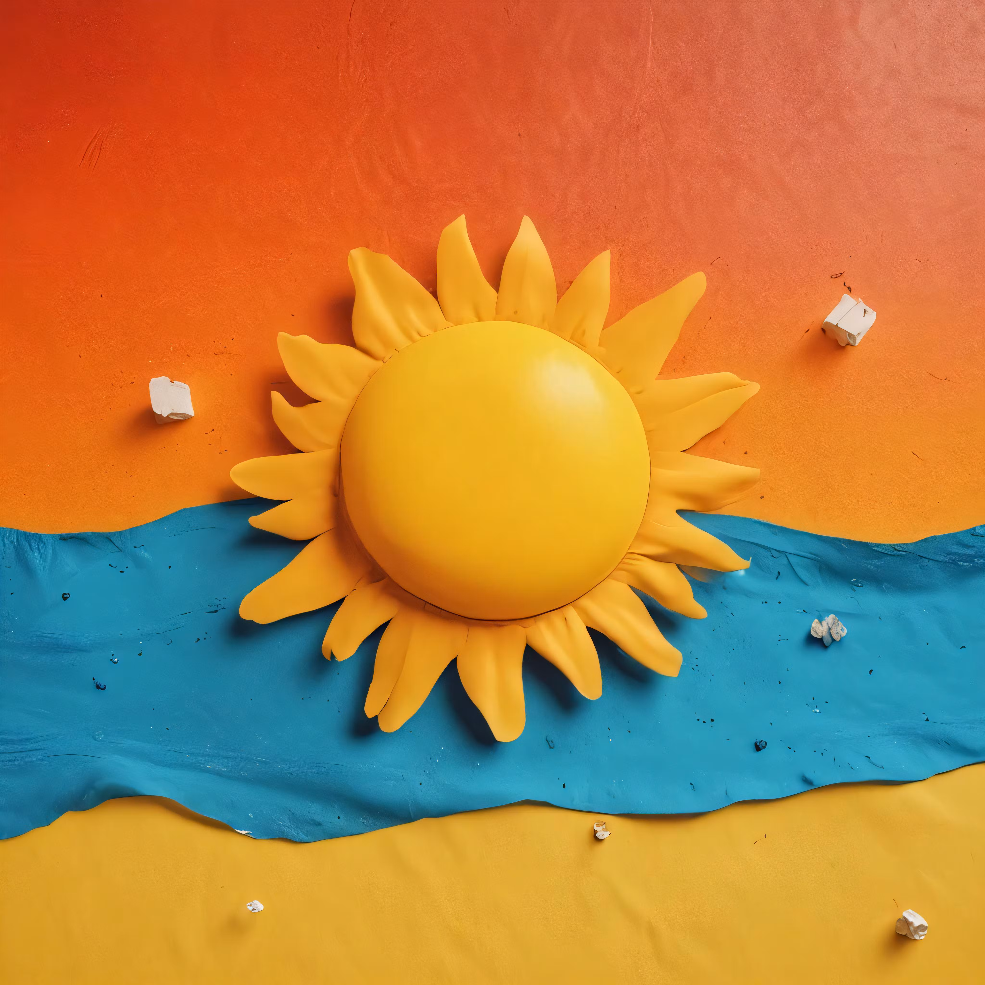High resolution picture, free to use, a plastic yellow and blue sun sitting on a multicolored surface