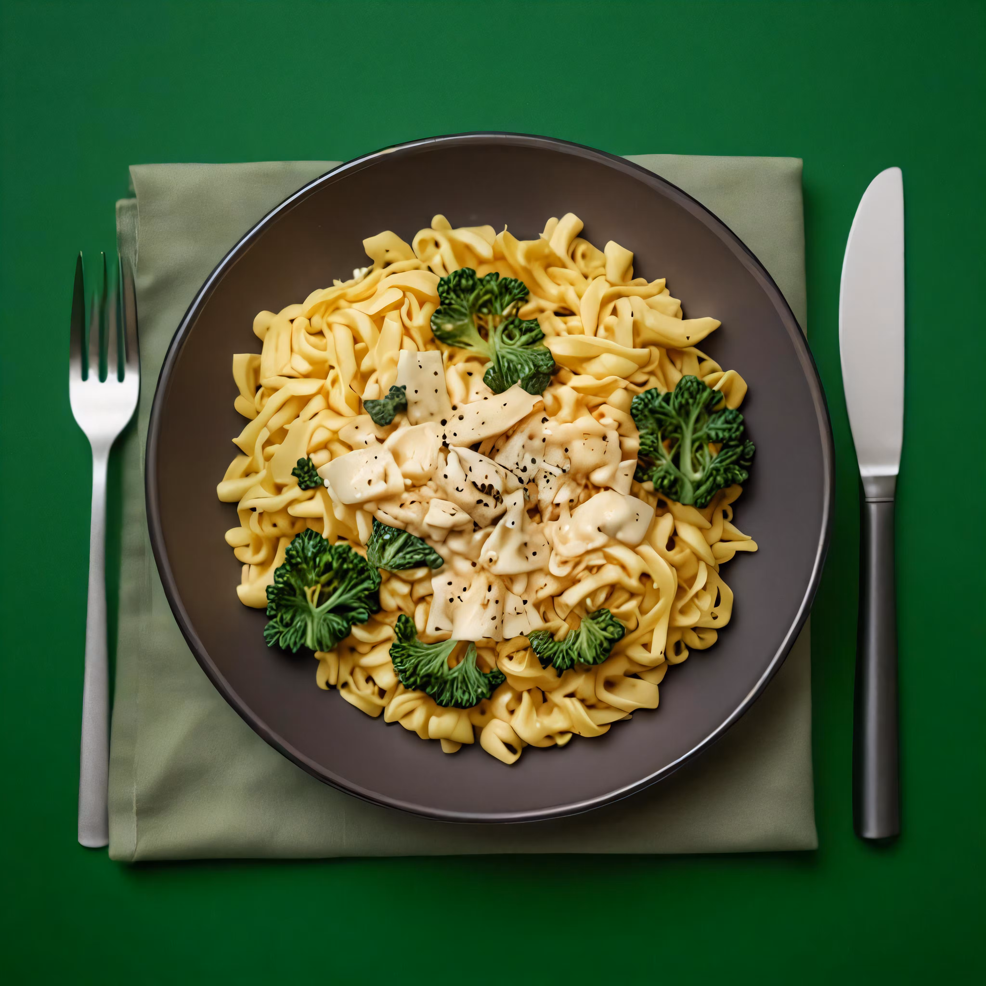 High resolution picture, free to use, a plate filled with pasta topped with chicken and broccoli