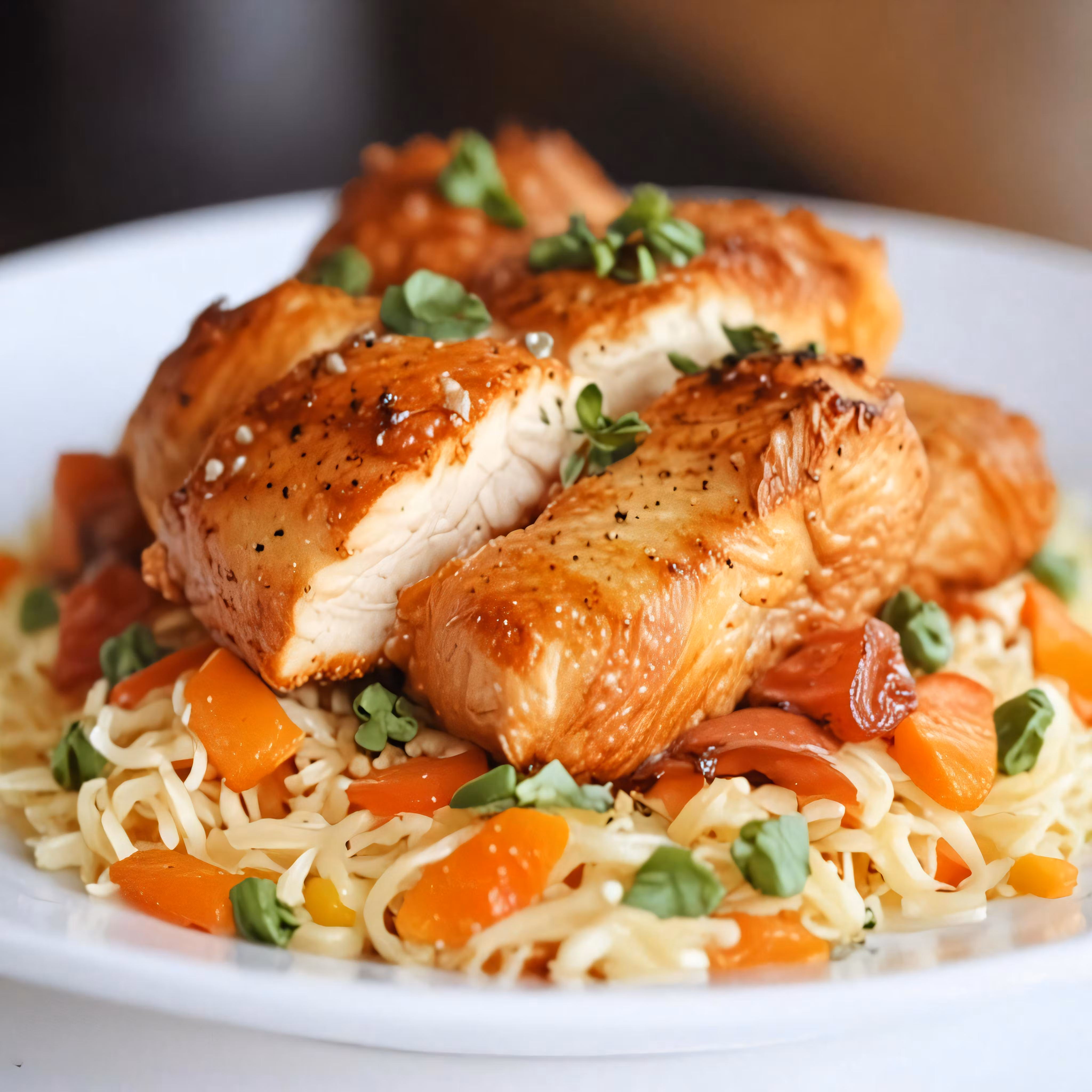High resolution picture, free to use, a plate filled with rice and chicken topped with carrots