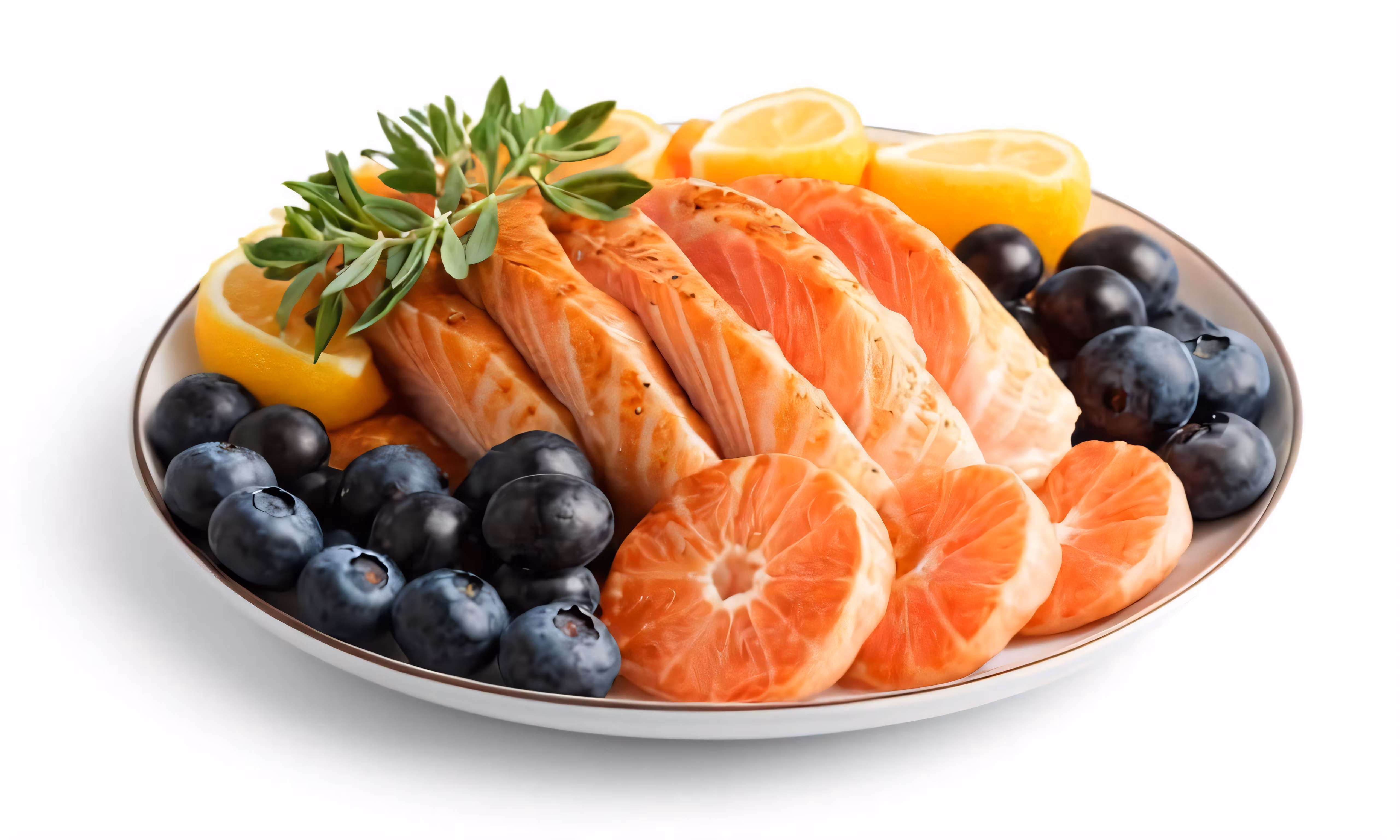 High resolution picture, free to use, a plate of food including fish, oranges, and blueberries