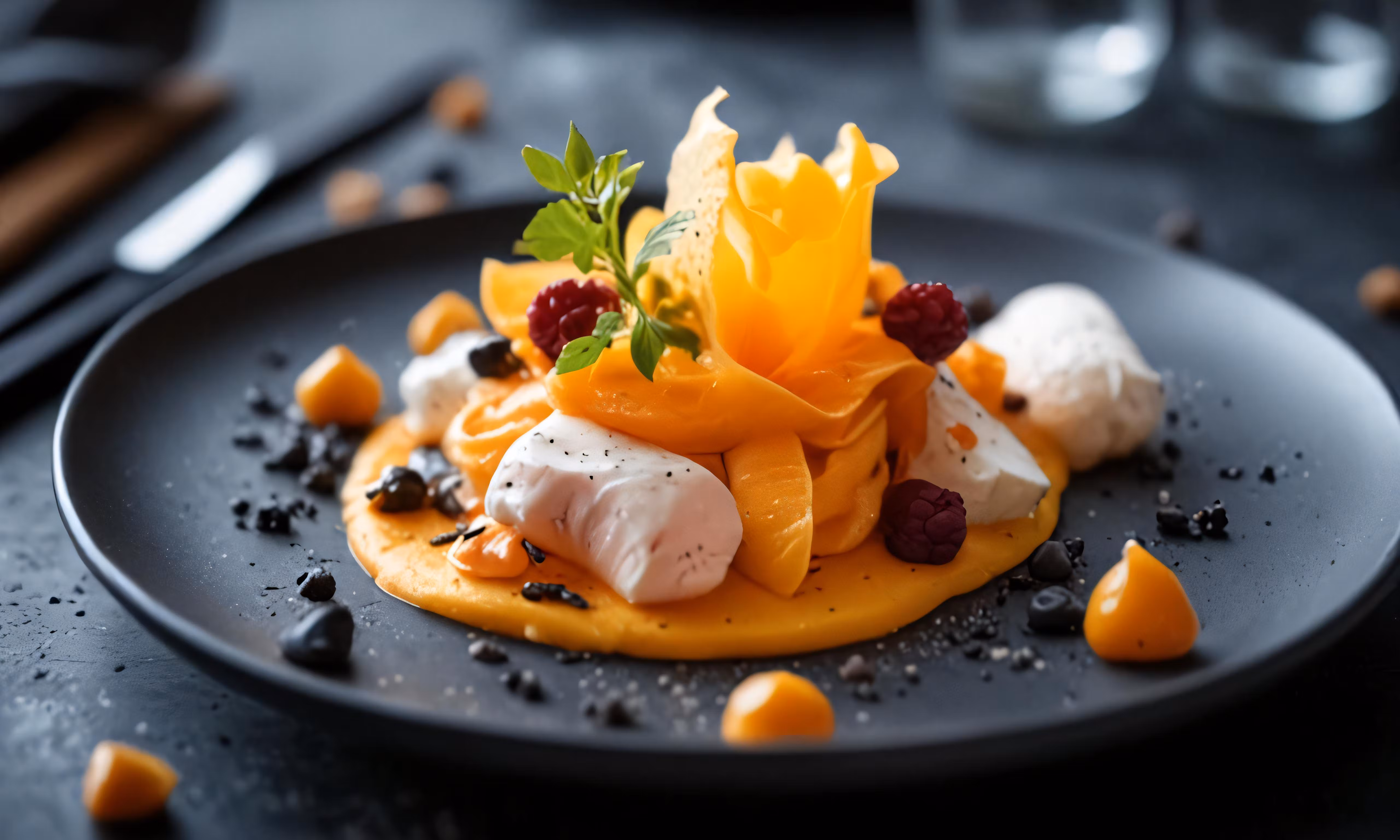 High resolution picture, free to use, a plate topped with orange food and vegetables