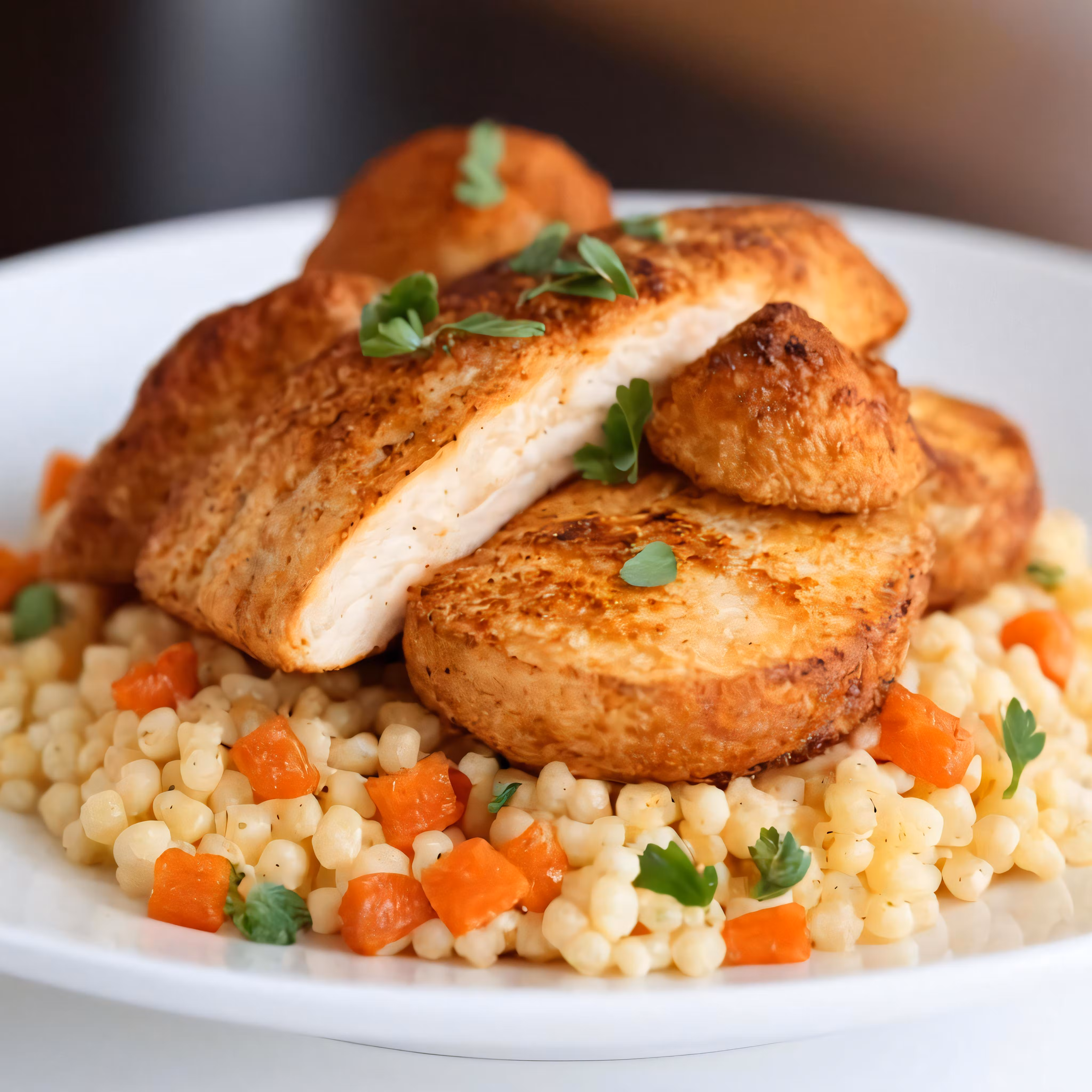 High resolution picture, free to use, a plate with cooked food items including rice and chicken