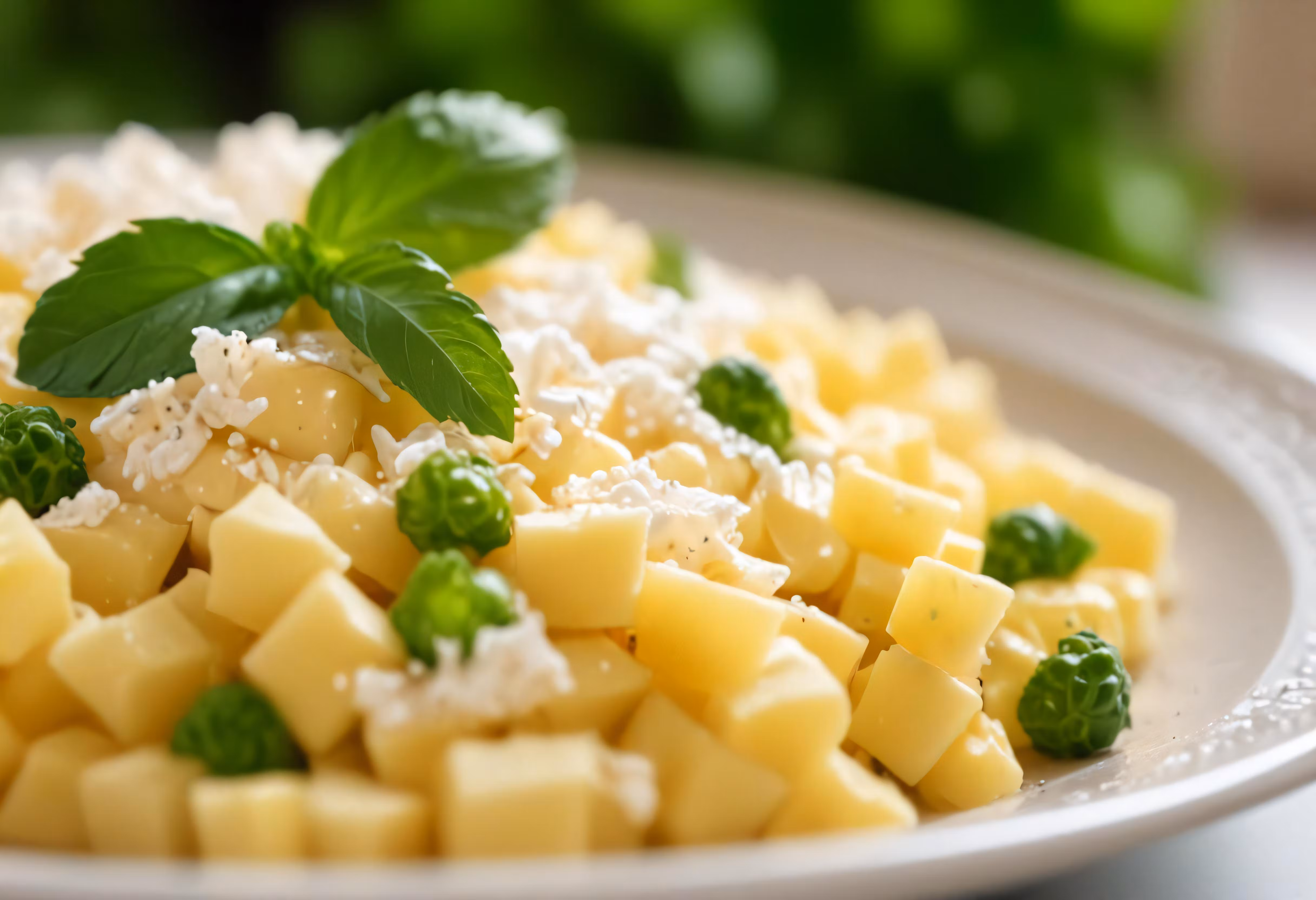 High resolution picture, free to use, a plate with some diced up cheese and basil