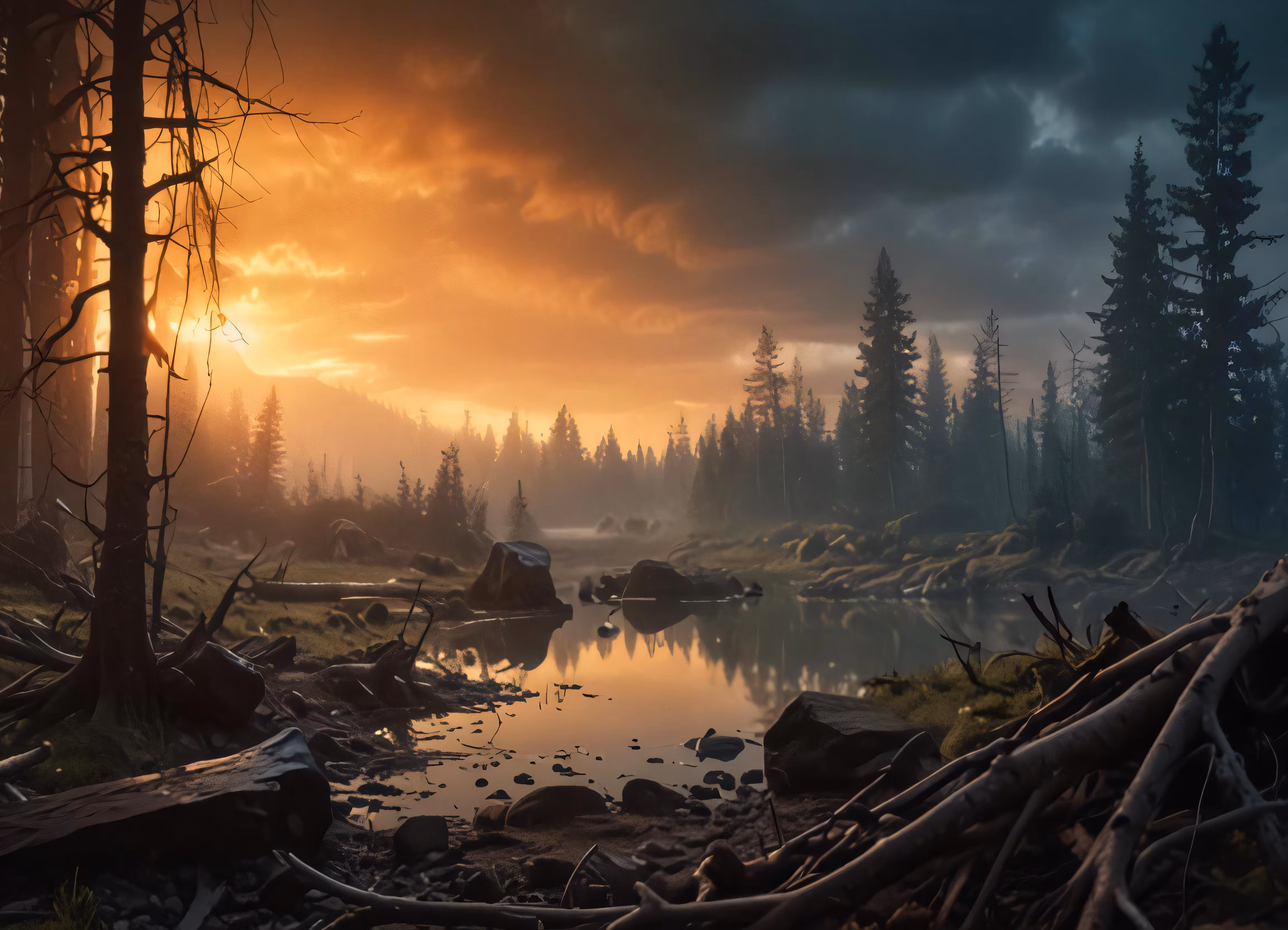 High resolution picture, free to use, a pond surrounded by a forest filled with lots of trees