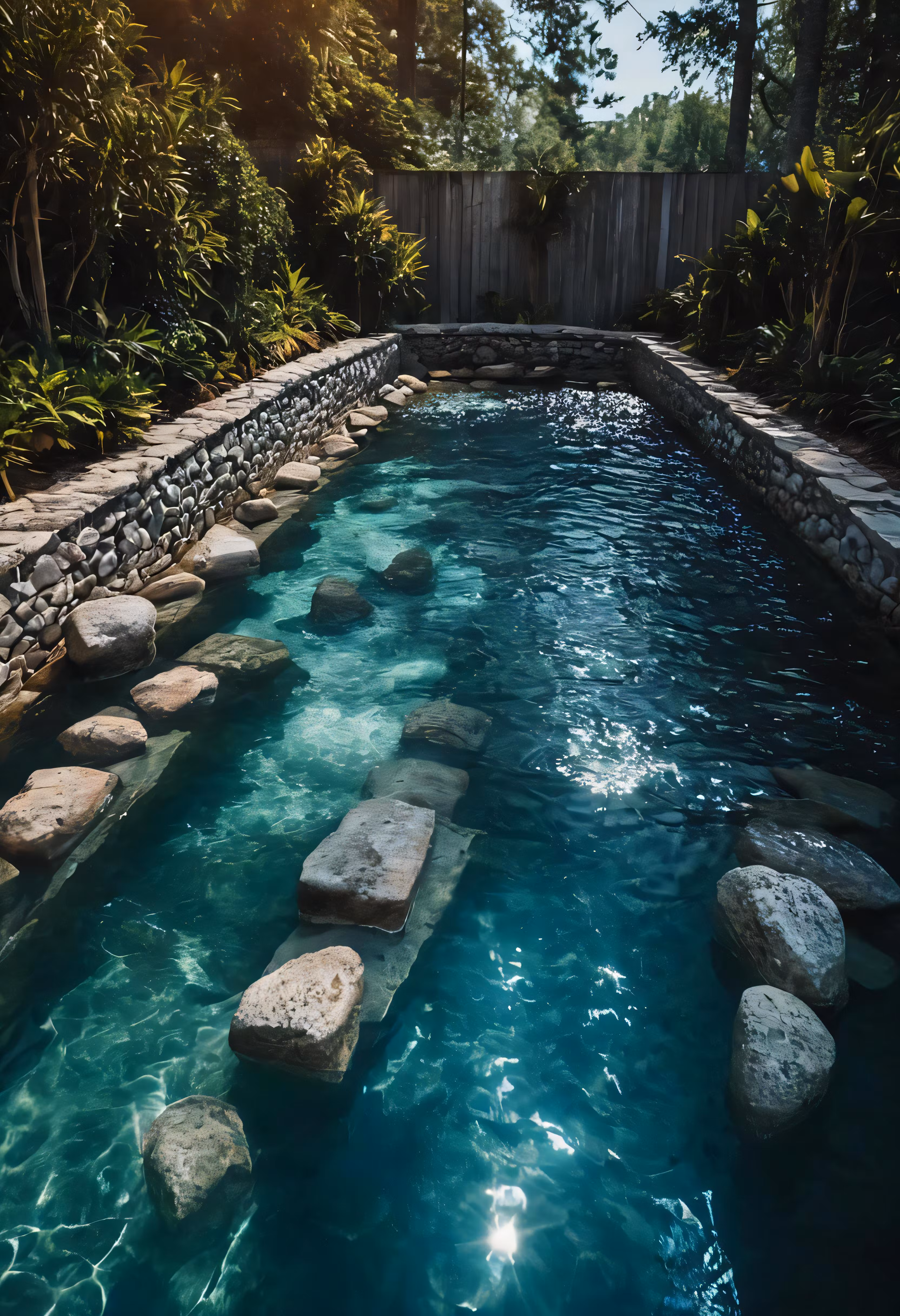 High resolution picture, free to use, a pond with rock walls and blue water