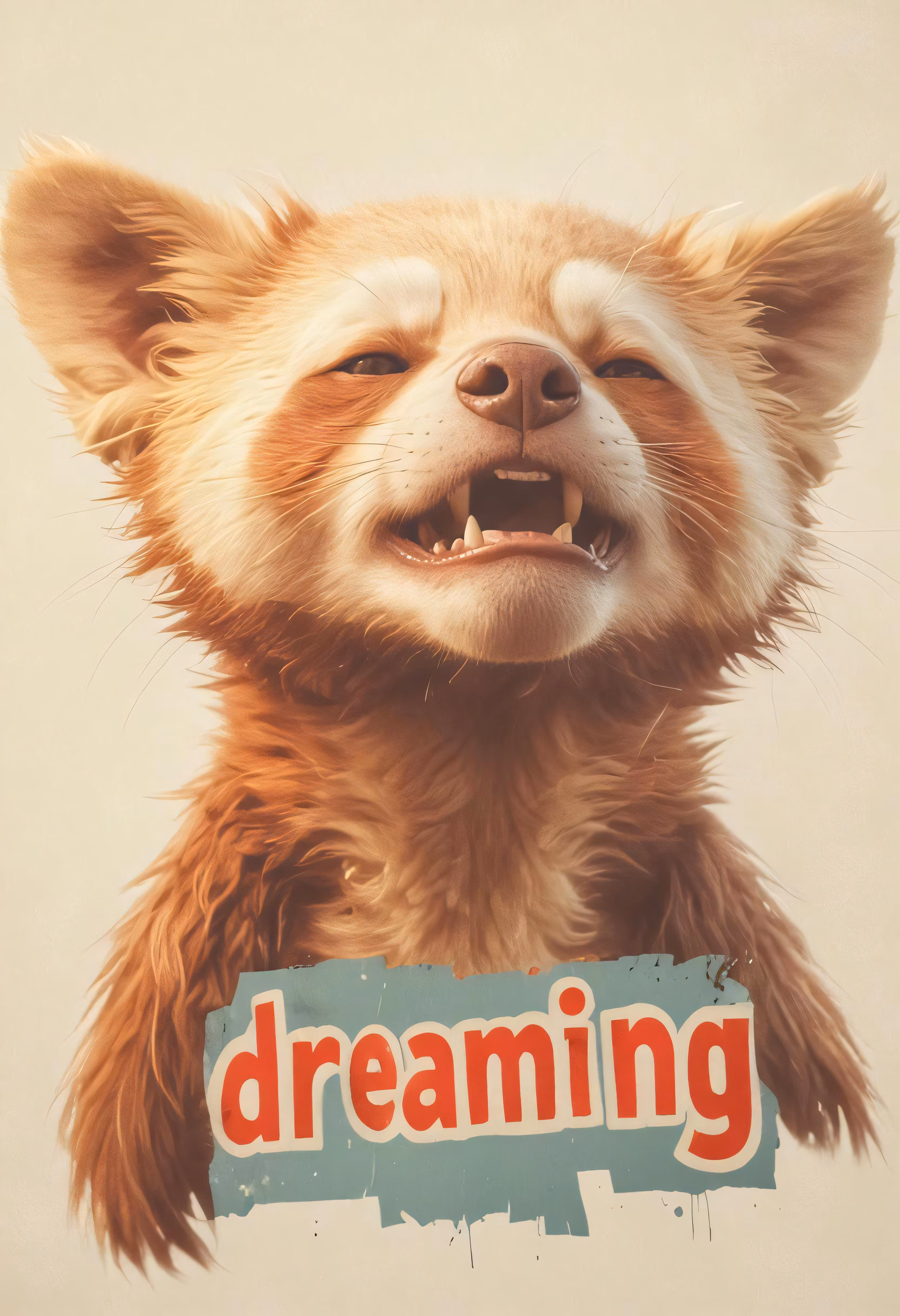 High resolution picture, free to use, a poster depicting a smiling dog with his eyes closed, with a sign below it that says dreaming